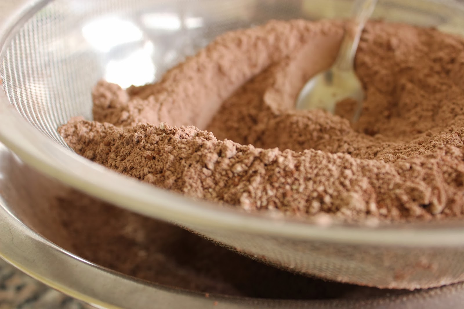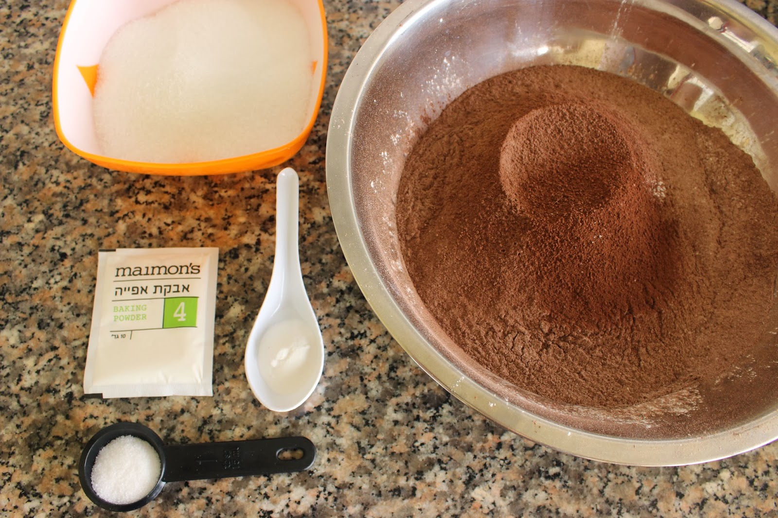 2. מערבבים קמח, קורנפלור, סוכר, אבקת קקאו (רצוי מאד לנפות), אבקת אפיה, סודה ומלח בקערה גדולה.