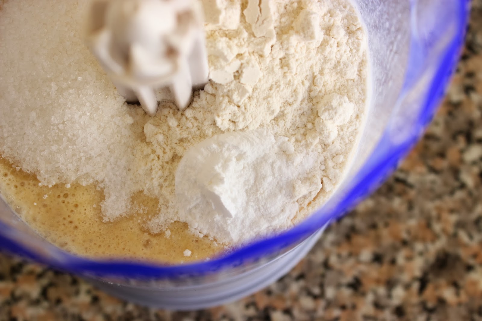 3. מוסיפים קמח, אבקת אפיה, מלח וסוכר. מעבדים שוב, רק עד לקבלת בלילה חלקה.