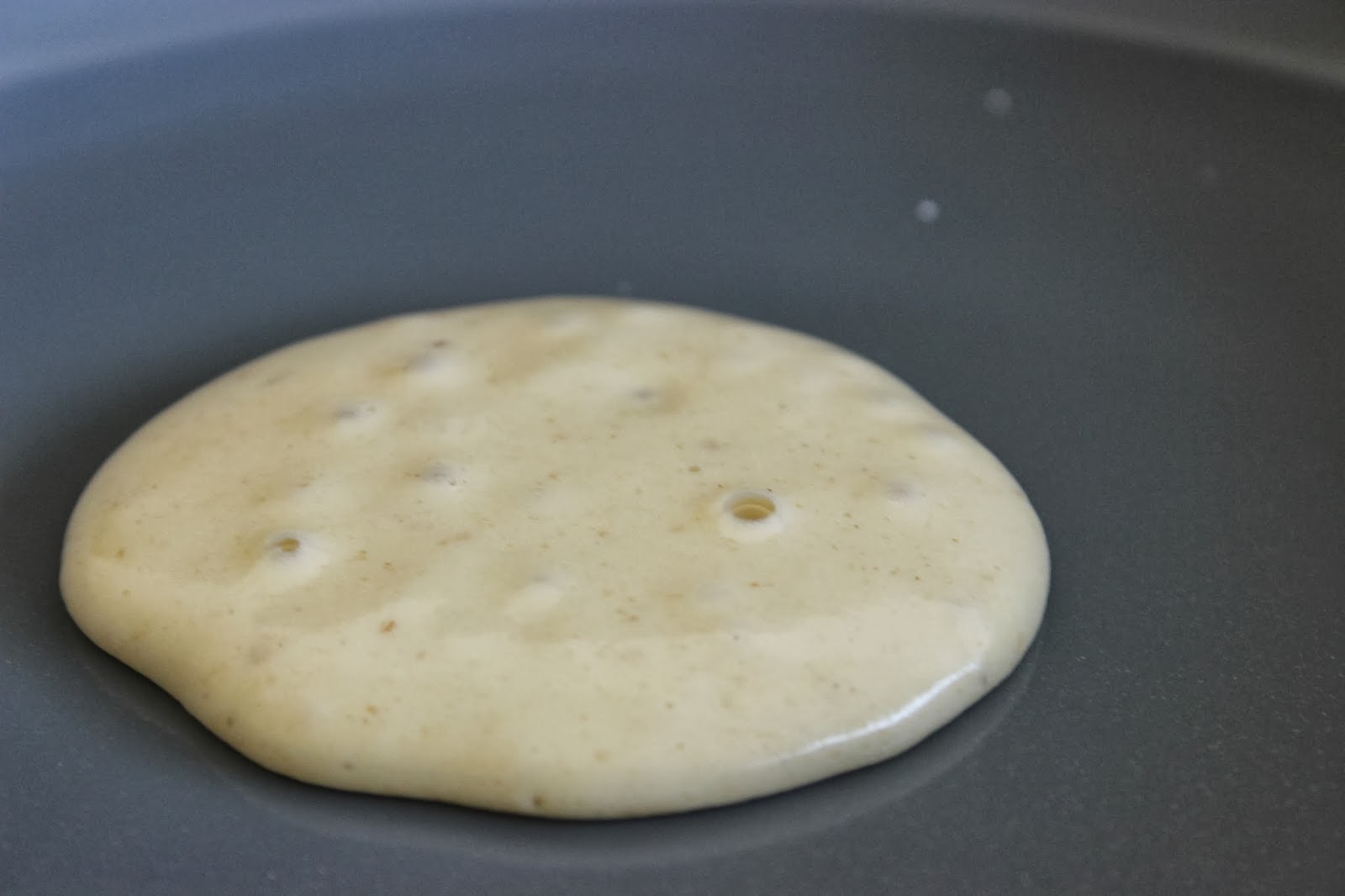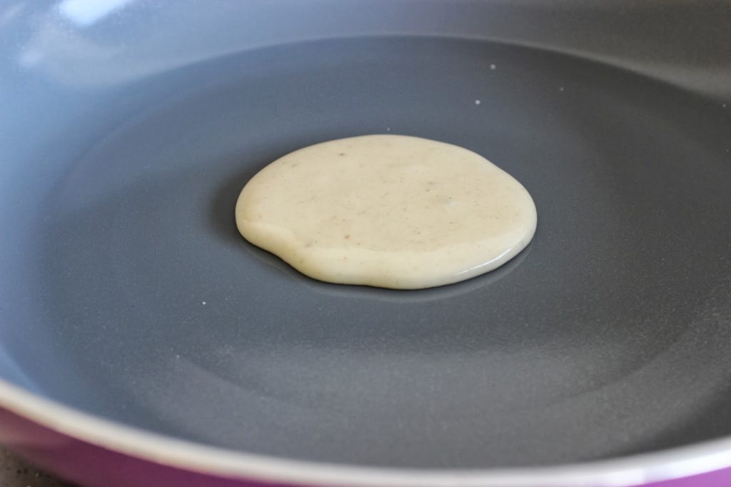 6. יוצקים כפות מהבלילה למחבת. מטגנים חצי דקה-דקה, עד שמתחילות להופיע בועות על פני הפנקייקים.