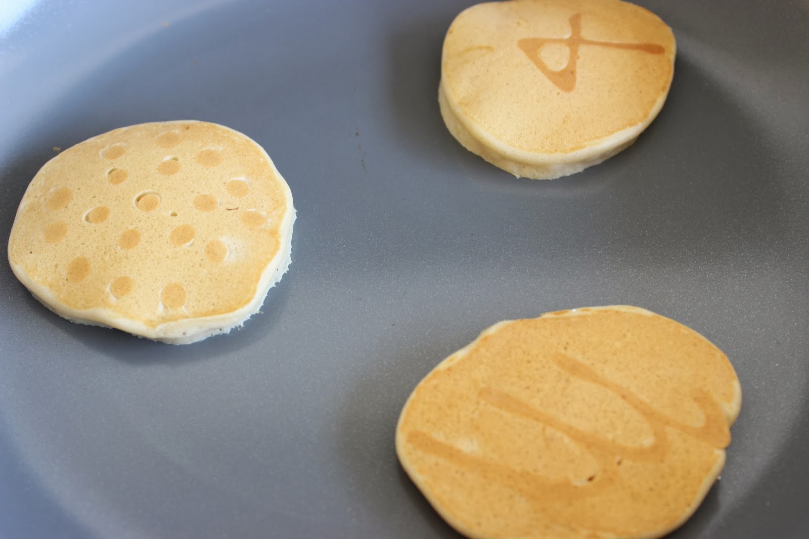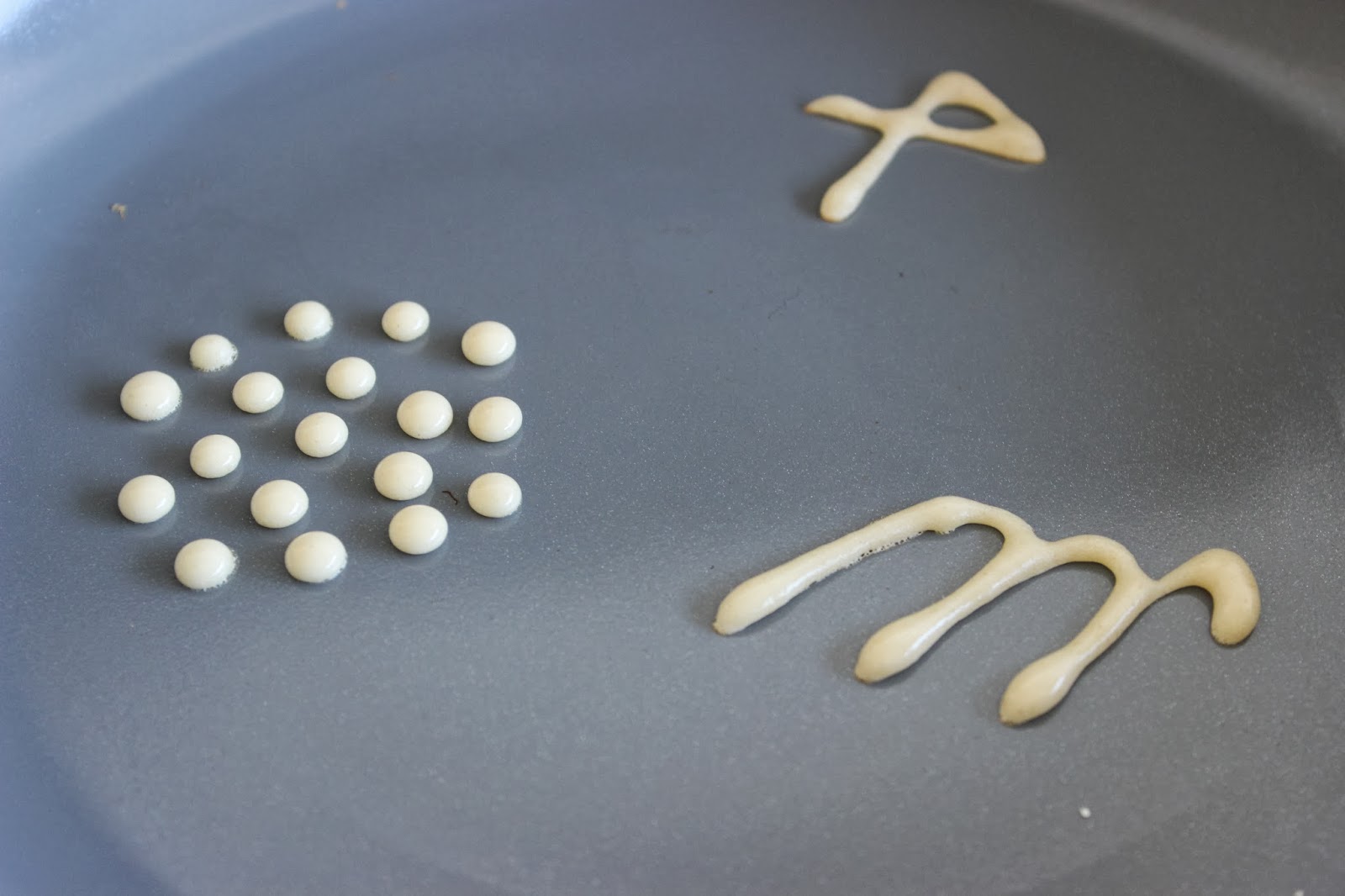 - אז בתמונות הראיתי לכם פנקייקים מצוירים, אבל באופן ההכנה לא כתבתי כלום על זה. למה? כי הנחתי שלא לכולם יש סבלנות לזה. אם אתם בכל זאת רוצים פנקייקים מצוירים, זה מה שעושים: העבירו חלק מהבלילה לבקבוק לחיץ. ודאו שהבלילה ממש חלקה, אחרת יהיה לכם קשה לצייר. ציירו בעזרת הבקבוק מה שבא לכם, היישר לתוך המחבת. שימו לב – אתם צריכים לצייר את מה שזה לא יהיה שתרצו בתמונת ראי, כי זה יהיה החלק העליון של הפנקייק אחרי שנטגן ונהפוך. סבבה? סבבה. קיצור. מטגנים קצת, משהו כמו דקה, ואז יוצקים בערך כף בלילה מעל הציור (או כמה שתרצו, תלוי בגודל הפנקייקים שלכם). ממשיכים לטגן כרגיל. אולי בהתחלה זה לא יצא לכם כל כך טוב – הציור יצא מבולגן או לא כהה מספיק לעומת הפנקייק עצמו, אבל אם תתאמנו מספיק, בסוף יהיה מגניב.