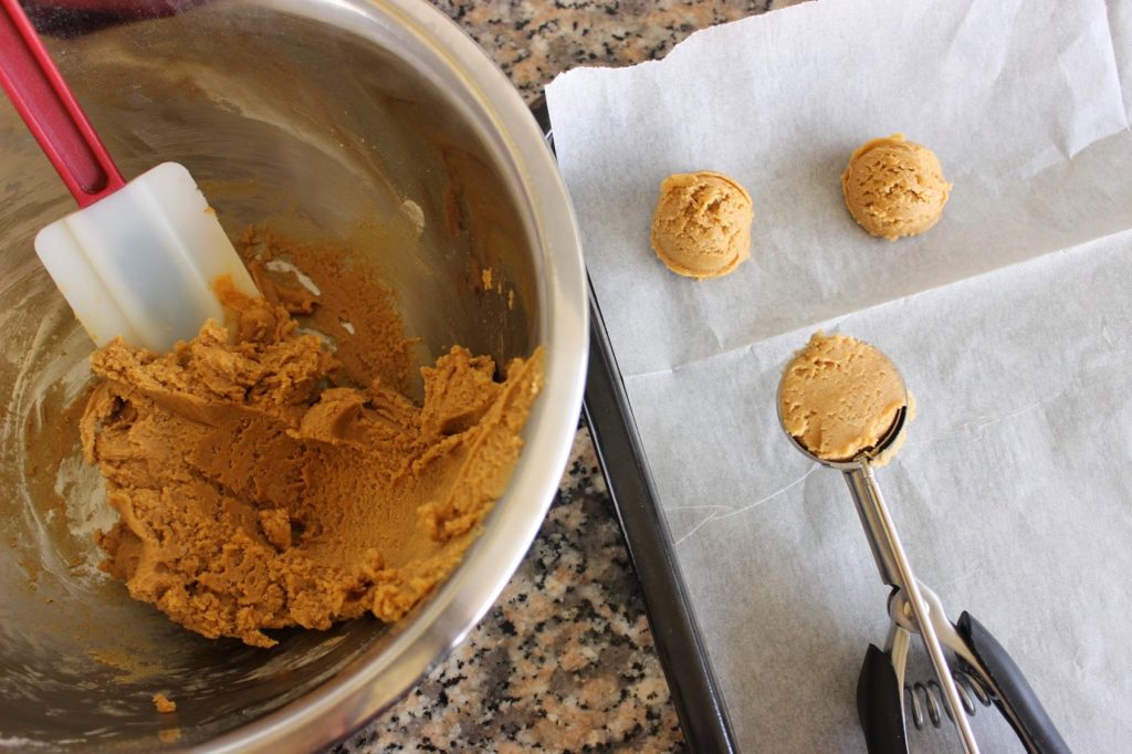 3. יוצרים כדורים מהבצק – ידנית, או עם כף גלידה קפיצית – ומניחים בתבנית. אין צורך לרווח יותר מדי, העוגיות לא מתפשטות במהלך האפיה.