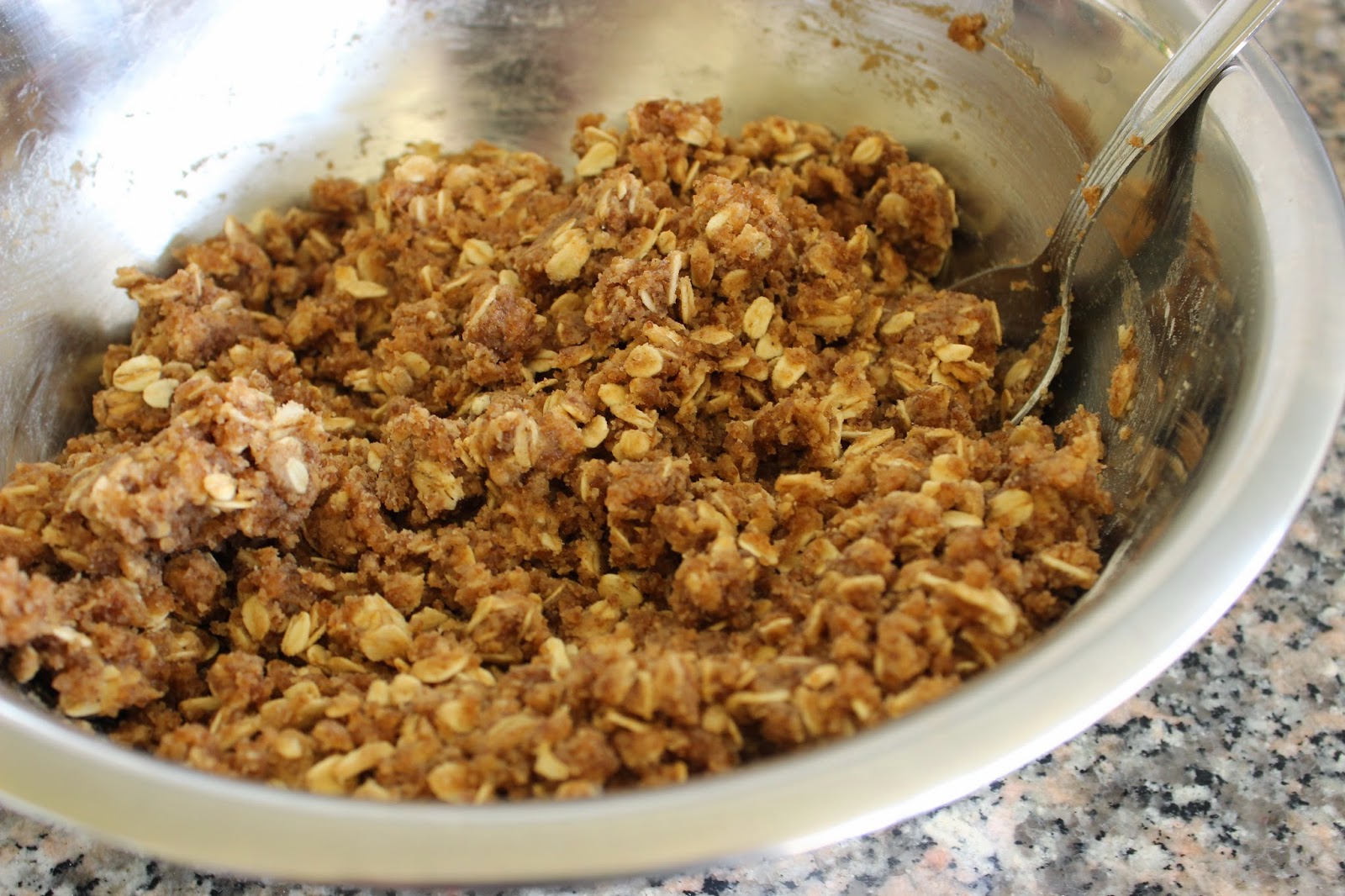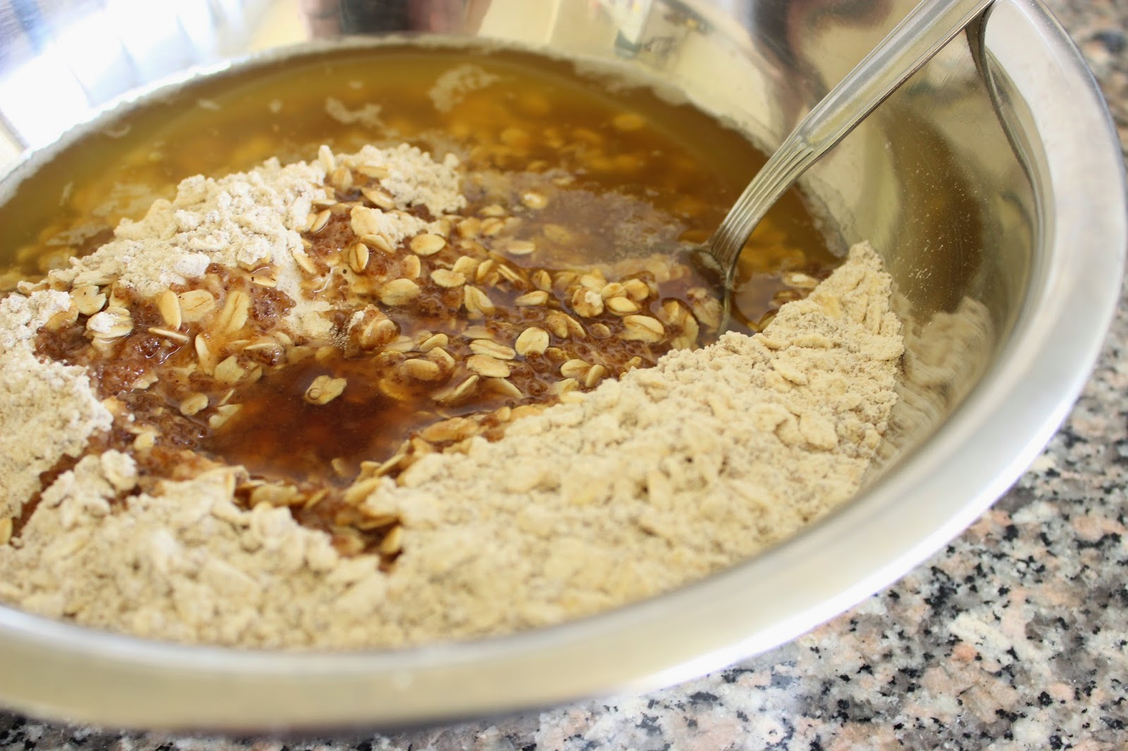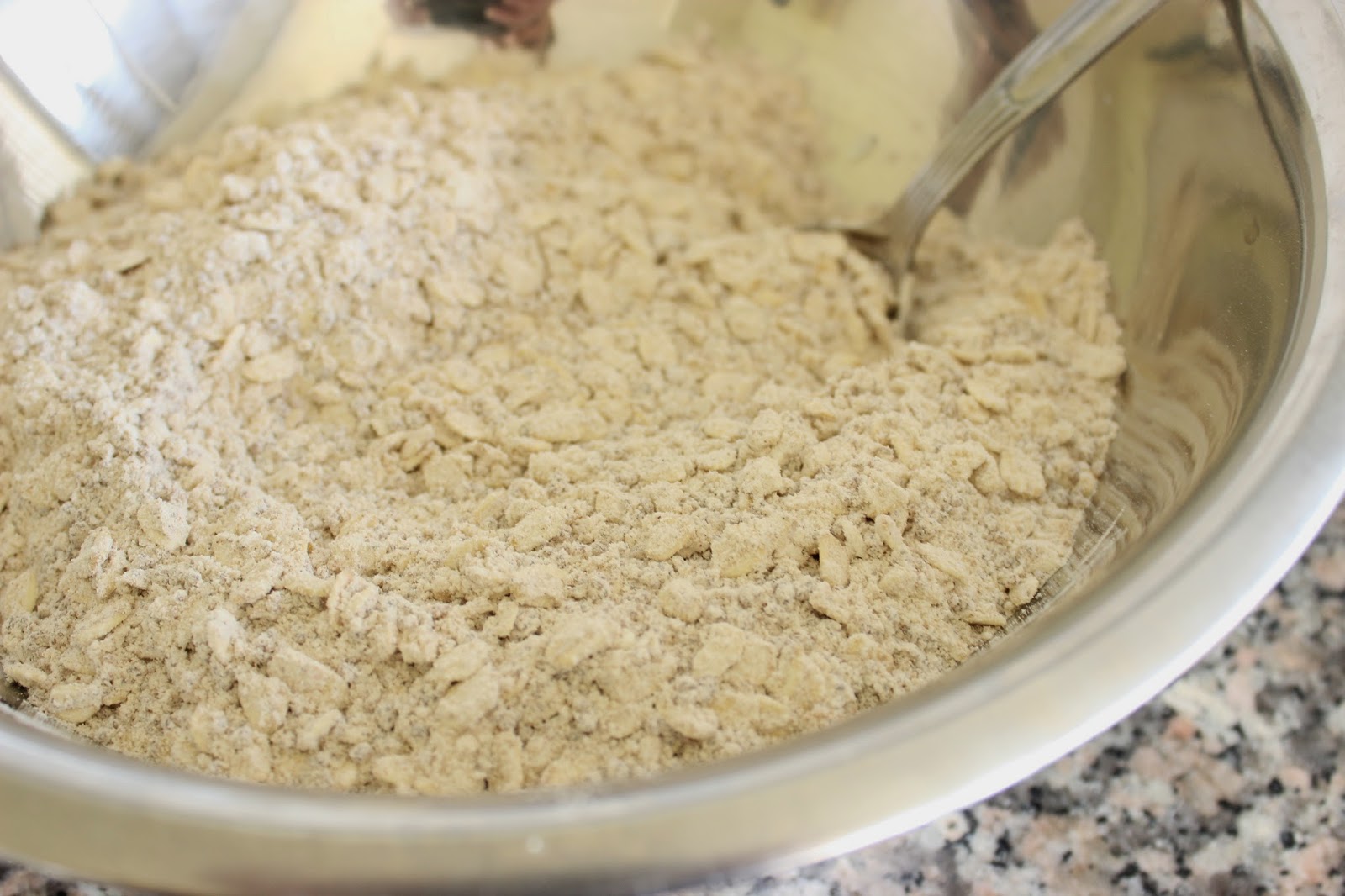 4. בינתיים מערבבים בקערה בינונית שני סוגי קמח, סודה, קינמון, מלח, שיבולת שועל וסוכר.