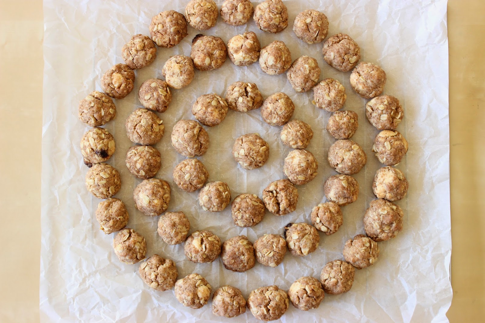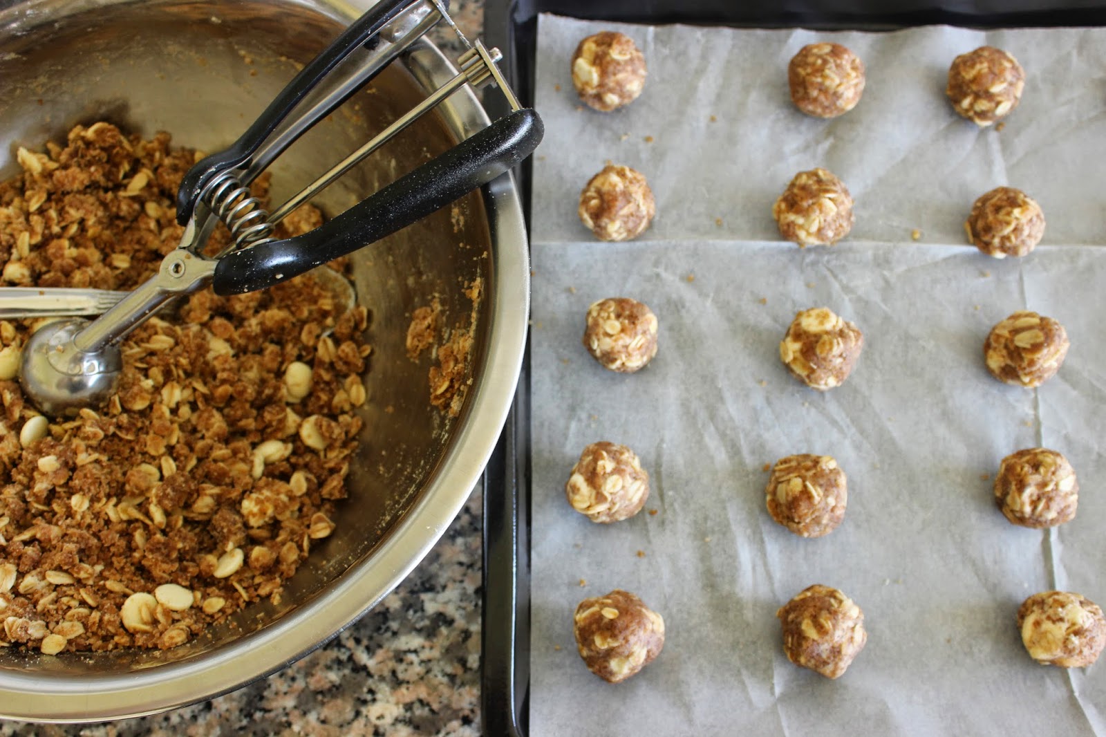 8. יוצרים עוגיות ומניחים בתבנית. אפשר ליצור כדורים ולגלגל אותם ידנית, אפשר – אם הבצק משתף פעולה – להשתמש בכף גלידה קפיצית לטובת העניין. מרווחים מעט, אבל לא המון – העוגיות לא מתפשטות יותר מדי. אם רוצים, אפשר לשטח אותן מעט בעזרת האצבעות לפני האפיה.