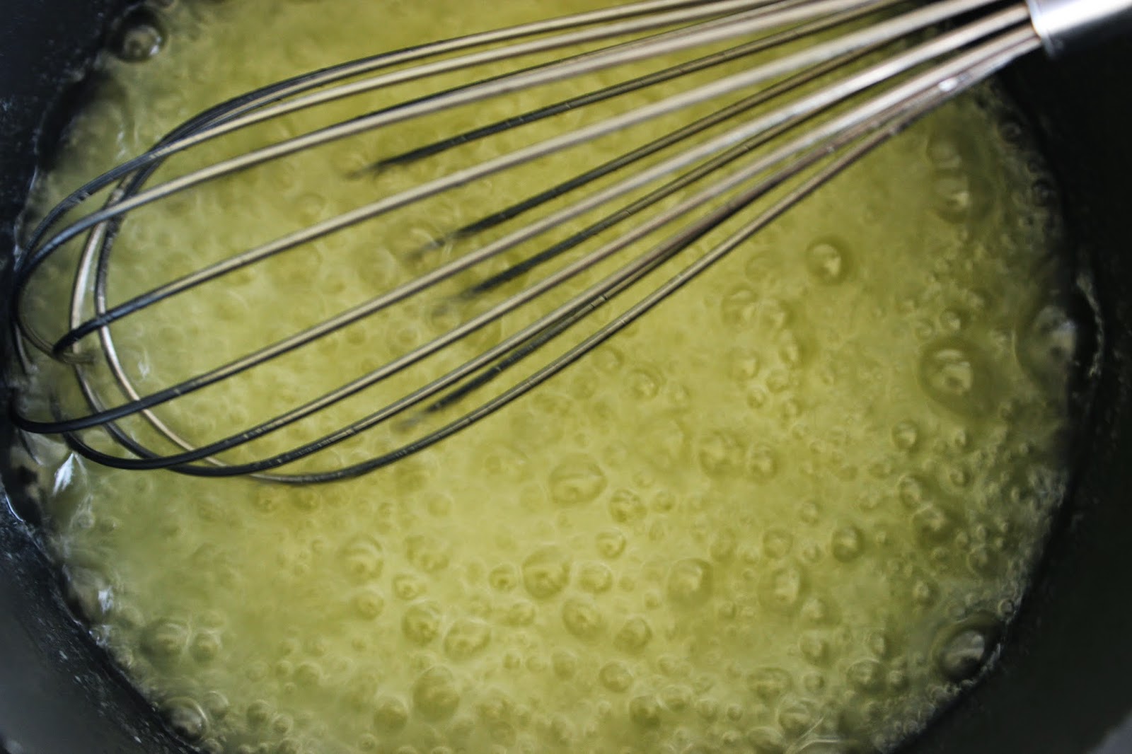 2. מתחילים בהשחמת החמאה: מניחים חמאה בסיר קטן. ממיסים על אש בינונית-גבוהה. לאחר שהחמאה נמסה לגמרי, ממשיכים לבשל תוך כדי טריפה, בזמן שהחמאה מבעבעת, עד שמתחילים להופיע חלקיקים חומים והחמאה מריחה כמו גן עדן. מסירים מיד מהאש ומעבירים לקערה קטנה.