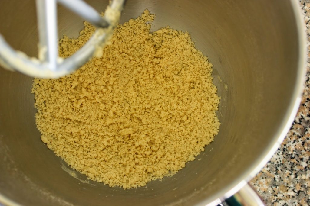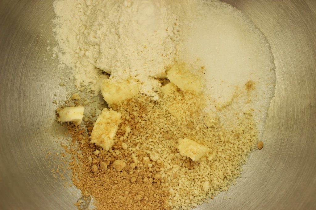6. מוסיפים אבקת שקדים, קמח, סוכר וג’ינג’ר. מחברים וו גיטרה ומערבבים במהירות בינונית, עד לקבלת פירורים במרקם של חול.