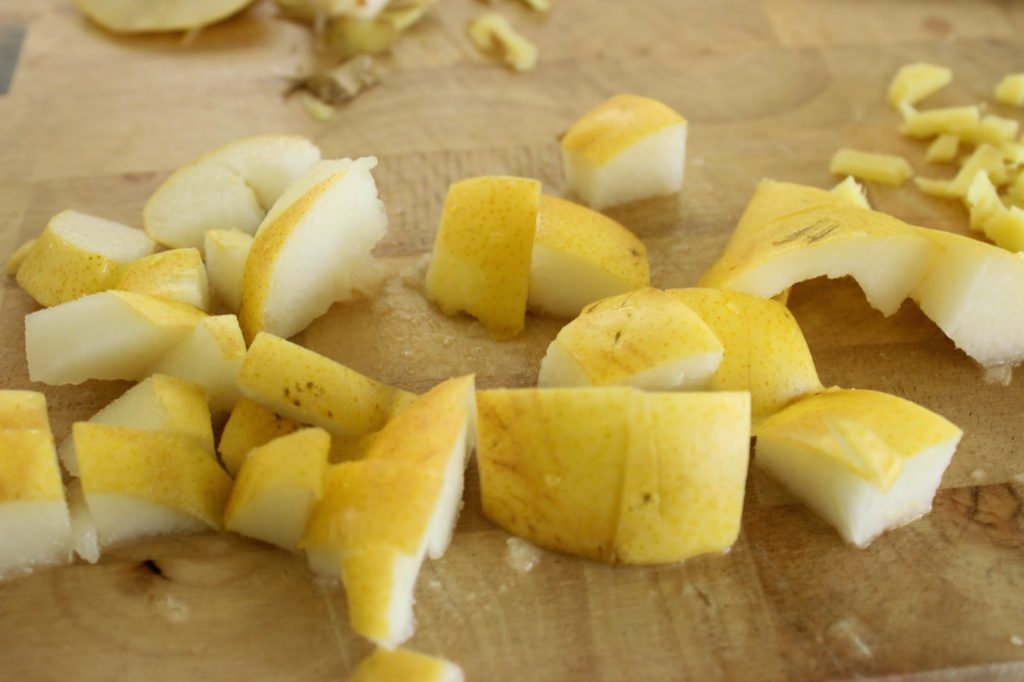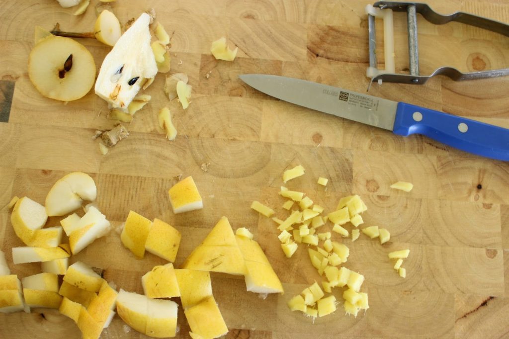 1. קולפים את האגסים וחותכים לקוביות בינונית – לא קטנות מדי, כדי שלא יהפכו לרסק. מניחים בסיר קטן.