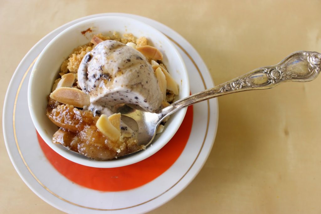 אני כן יודעת לומר לכם שהקרמבל היה טעים ממש. כי אגסים זה אדיר. והג’ינג’ר לגמרי עובד (אמרה אחת שלא אוהבת חריף, אבל החריפות של הג’ינג’ר היא אחרת. היא חריפות שמגיעה כחלק מקינוח, וזה לגיטימי לגמרי). ואם תצליחו להתאפק שניה, לא לאכול ישר מהתנור, אלא תשקיעו ותניחו כדור גלידה קרה* מעל הקרמבל החם, זה בכלל יהיה אחד מרגעי השיא בחיים שלכם (או שרק לי יש חיים כל כך עצובים, שזה היה אחד מרגעי השיא שלהם?). ורי טרו סטורי.