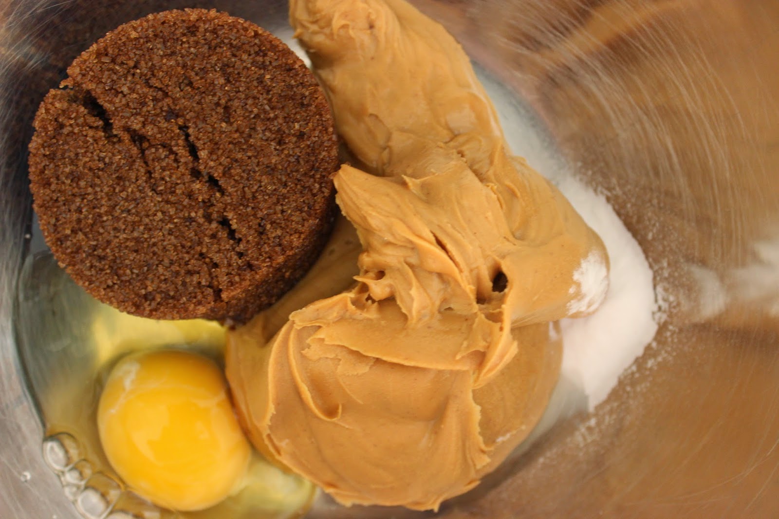 2. מניחים חמאת בוטנים, סוכר חום, ביצה וסודה בקערה. מערבבים היטב עם מטרפה או כף עד לקבלת בצק אחיד (ודביק למדי).