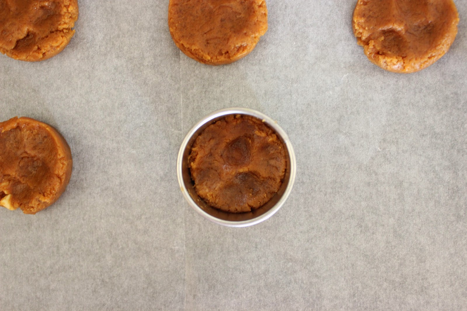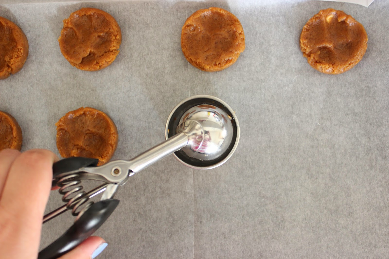3. בעזרת כף גלידה קפיצית קטנה, מניחים עיגולי בצק בתבנית. מרווחים קלות. אפשר גם לעשות את זה עם כפית רגילה ו/או לגלגל לכדורים בעזרת הידיים. פוחסים קלות עם האצבעות.