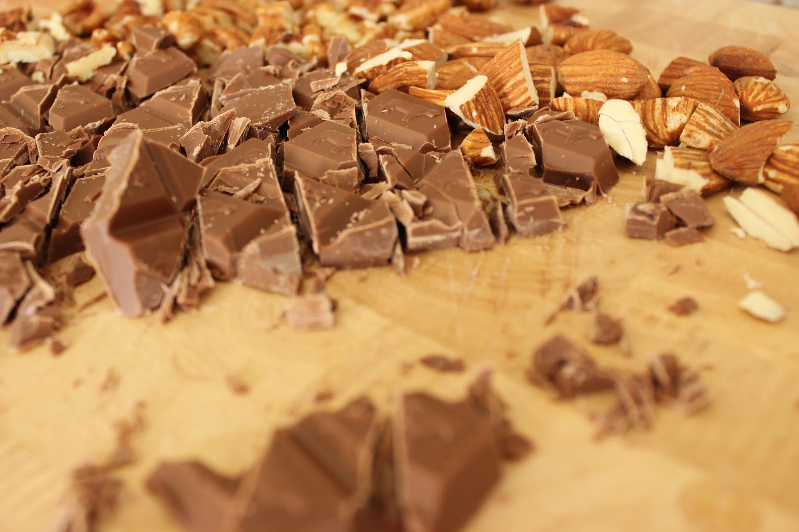 • לסיום, מבחינת התוספות למעלה – לכו על כל שילוב של שוקולד ואגוזים שמרגיש לכם נכון. מבחינתי שוקולד חלב יחד עם שקדים ופקאנים עבד יופי, אבל לכו עם האמת שלכם.