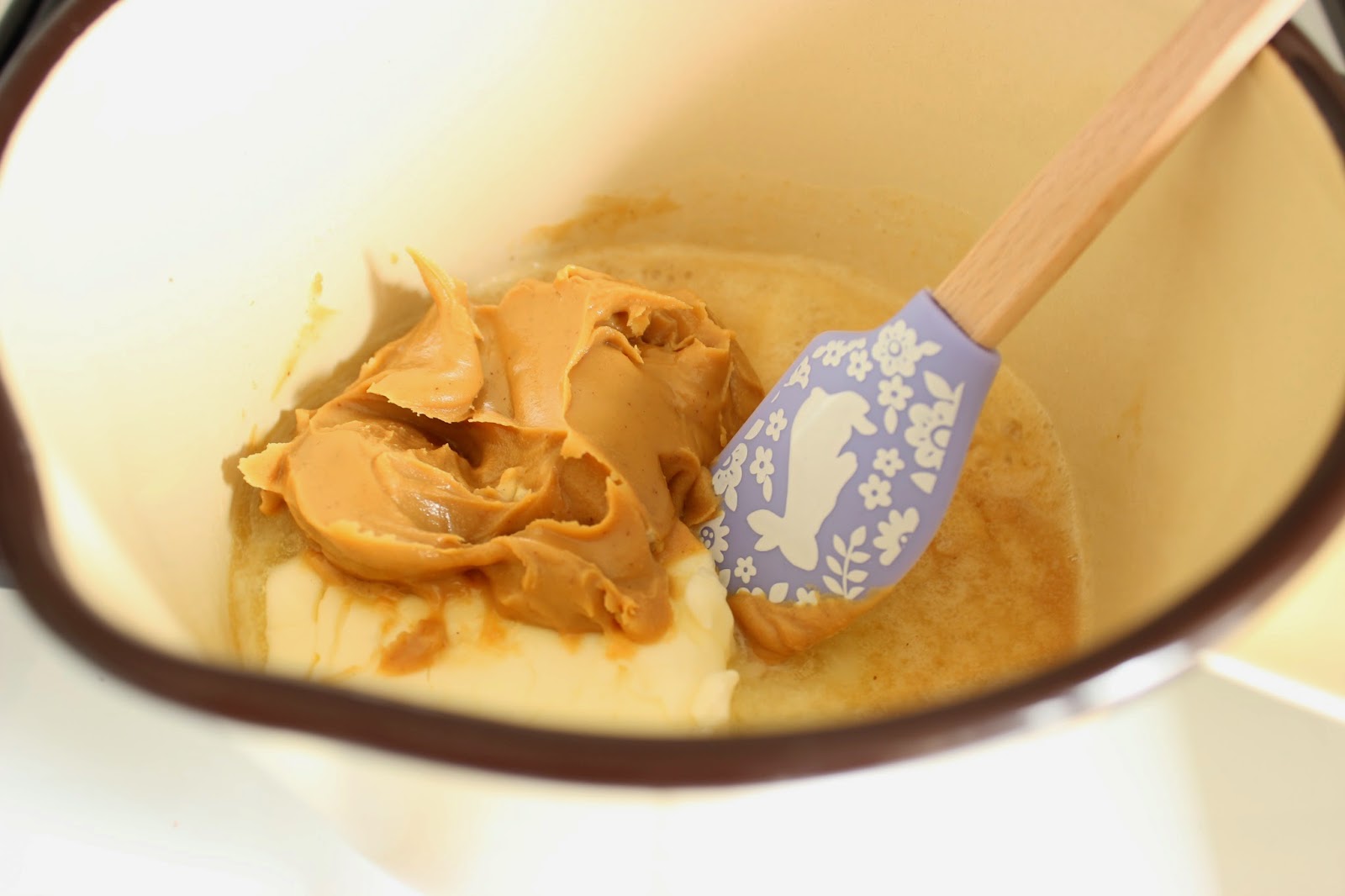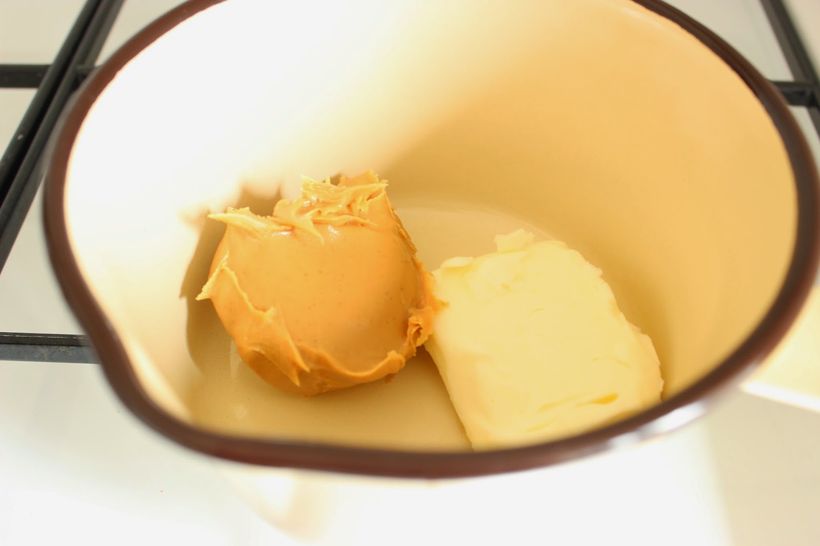 2. מניחים חמאה וחמאת בוטנים בסיר קטן וממיסים על אש נמוכה-בינונית. מניחים בצד.