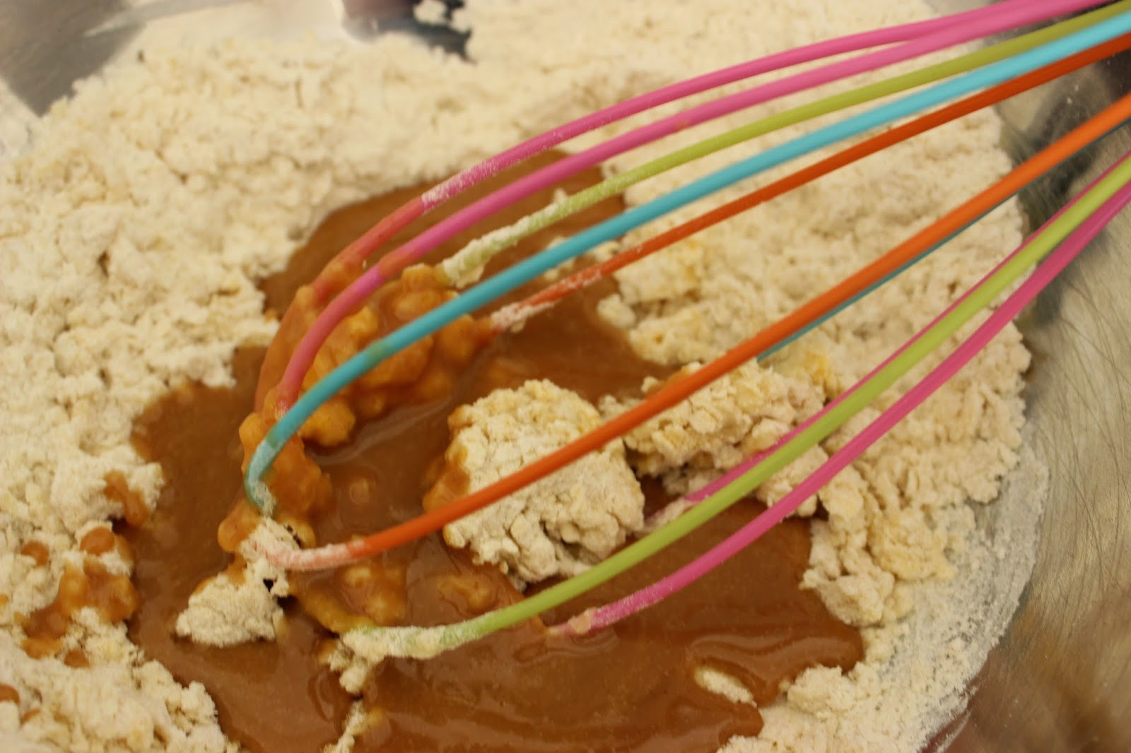 4. מוסיפים את החמאה וחמאת הבוטנים המומסות, יחד עם שני סוגי סוכר. מערבבים עד לקבלת בלילה אחידה.