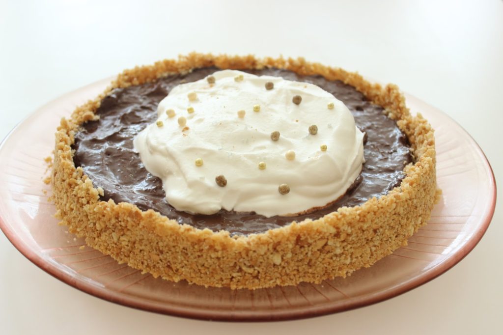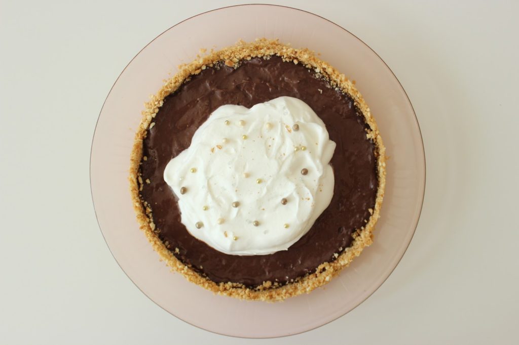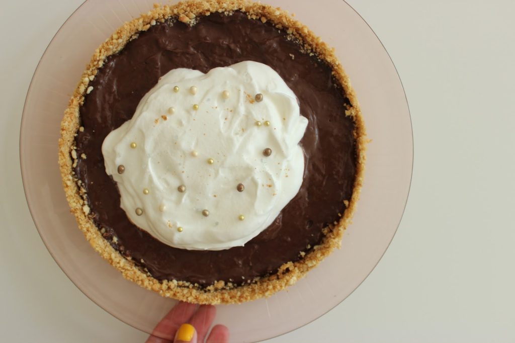 11. עורמים את הקצפת במרכז הפאי, מעל הפודינג (אל תשכחו להסיר את הניילון הנצמד 🙂 ). אם רוצים, מקשטים בבלינג בלינג כזה או אחר (סוכריות, נצנצים, שוקולד מגורר, אגוזים קצוצים, אבקת קקאו). או שהולכים על הקטע הבוגר והקלאסי, ומוותרים על זה. מה שמרגיש לכם נכון.