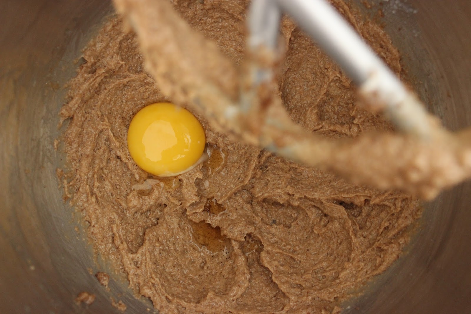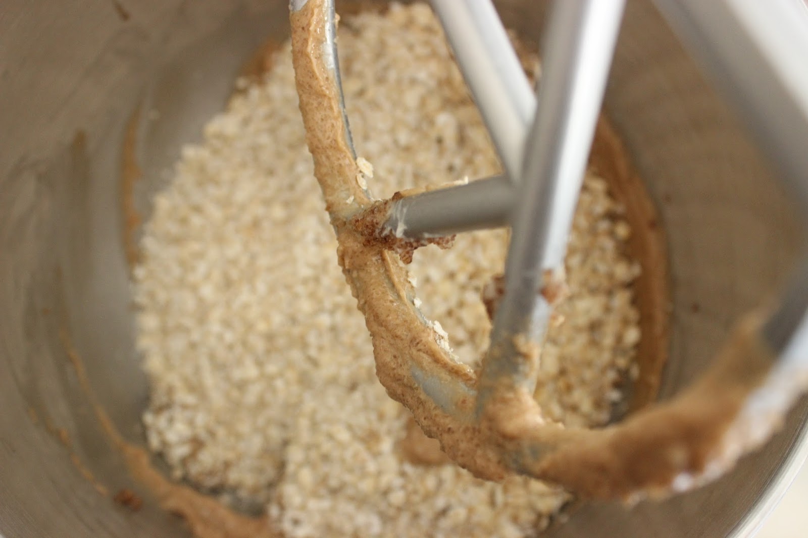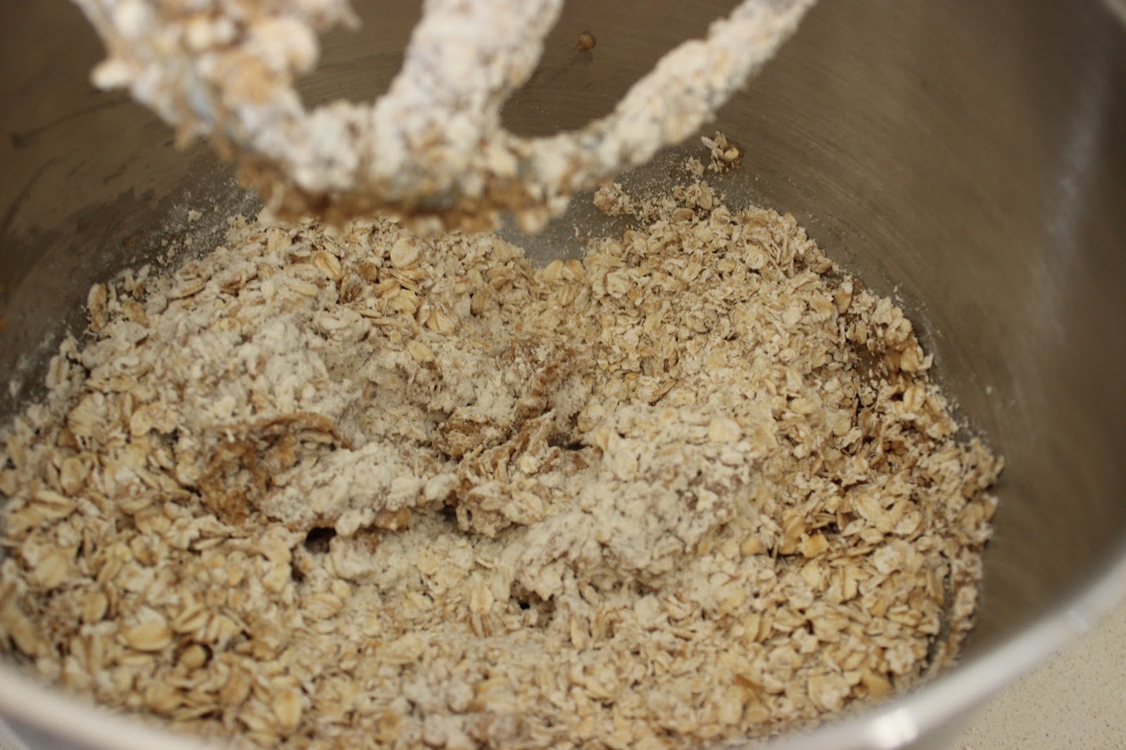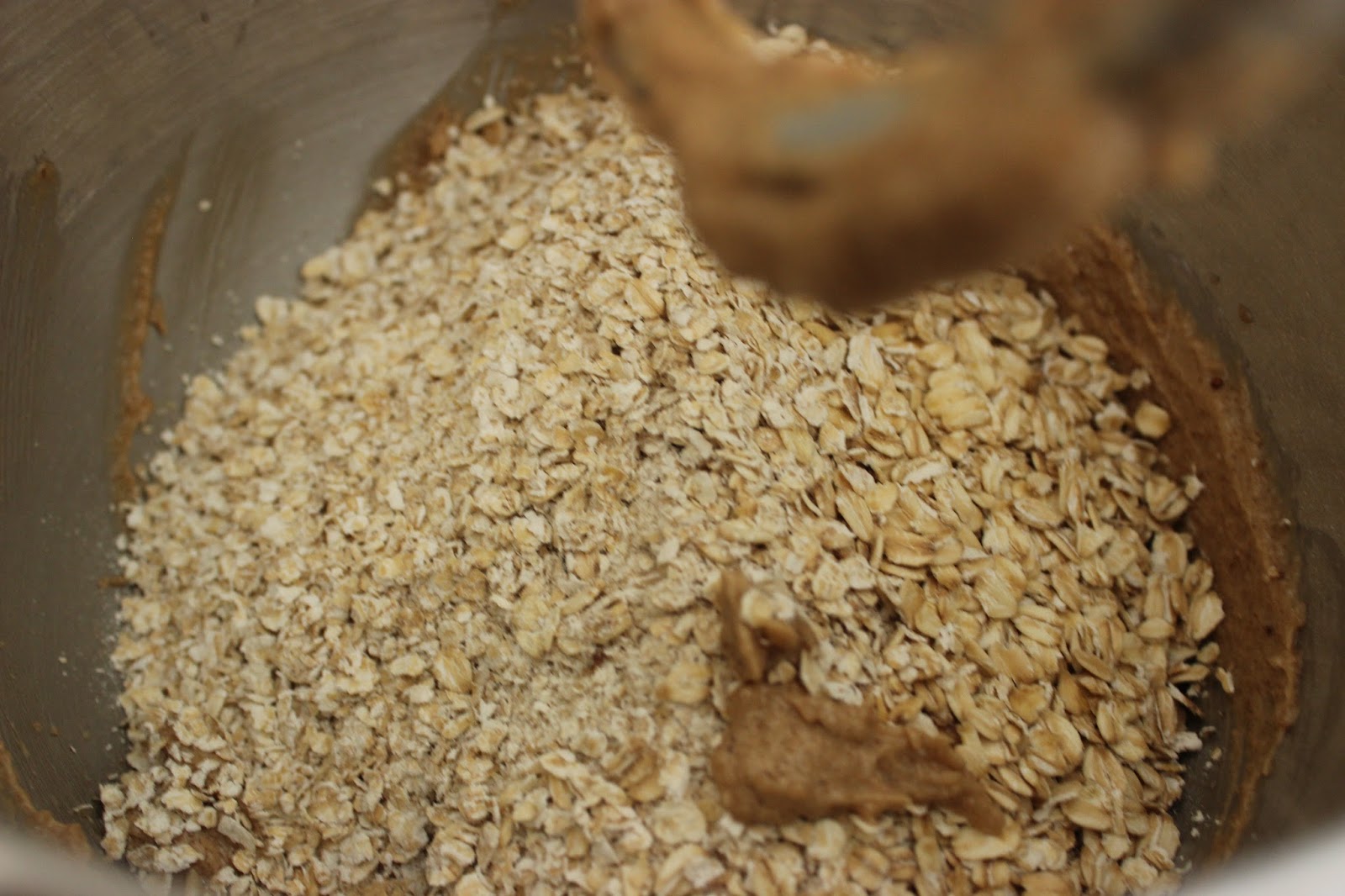 4. מוסיפים קמח, אבקת אפיה, אגוסז מוסקט, ג’ינג’ר, מלח ושיבולת שועל לקערה. מערבבים רק עד לקבלת בצק אחיד ודביק למדי.
