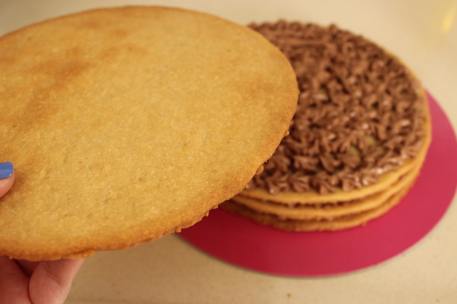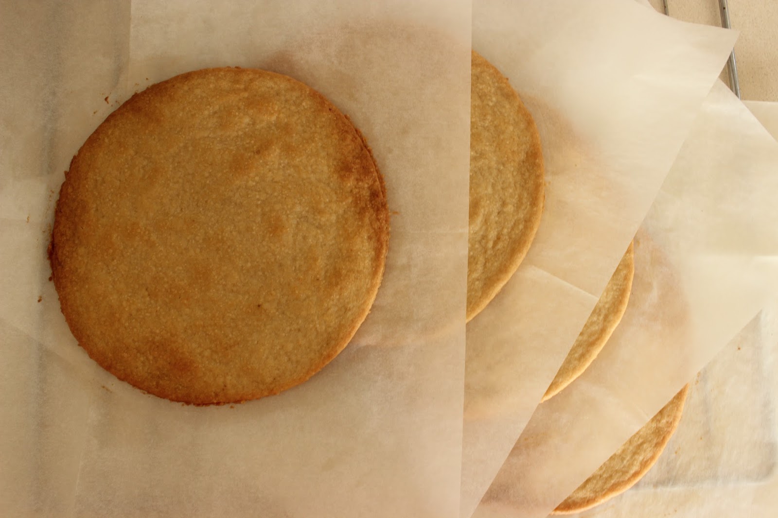 11. ממשיכים כך עם שאר דיסקיות הבצק, עד לקבלת ארבע עוגיות גדולות, זהובות, יפות.