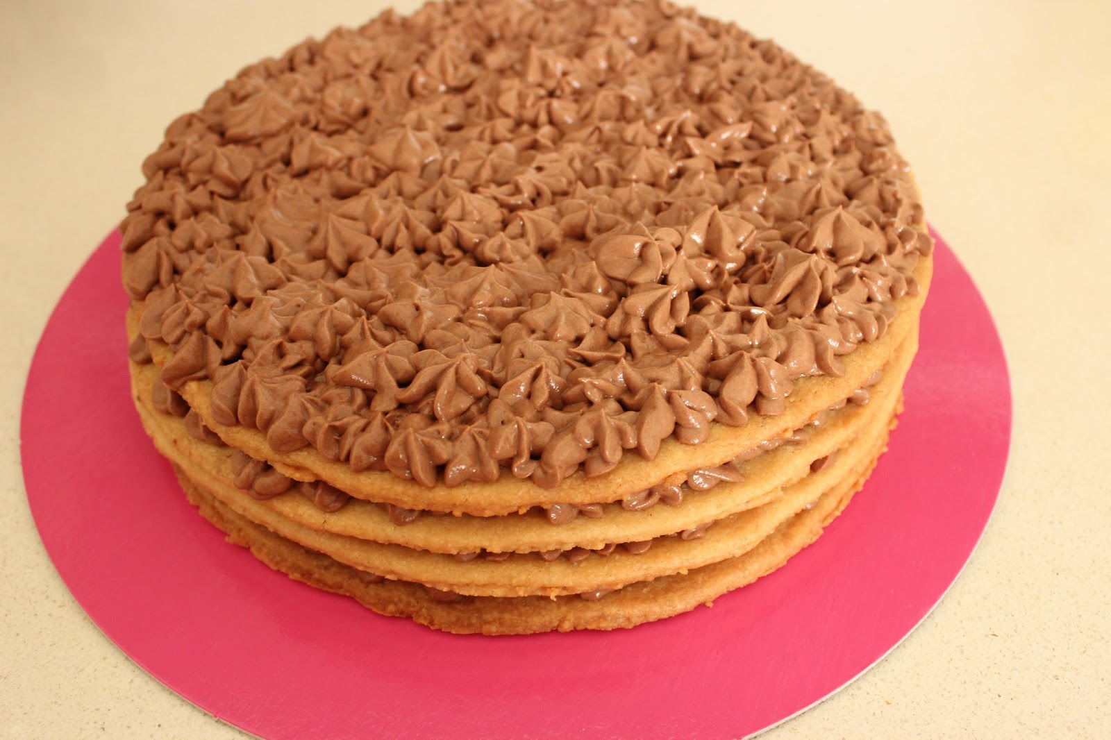 14. להרכבה: מניחים עוגיה אחת על צלחת הגשה (אפשר להדביק את העוגיה לצלחת בעזרת מעט קרם). מזלפים שכבת גנאש מעל העוגיה. מניחים עוגיה נוספת, מזלפים עוד קרם, וממשיכים כך עד לקבלת מגדל מהמם.