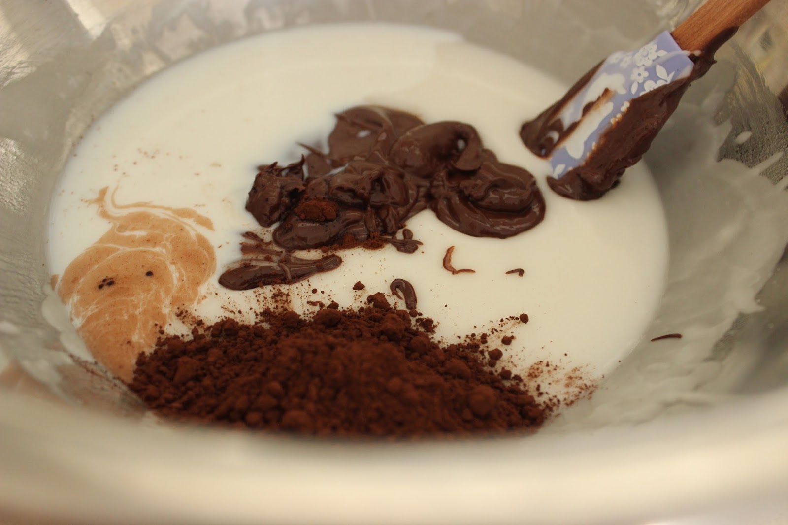 12. לאחר שכל העוגיות צופו בציפוי הלבן, מוסיפים אליו שוקולד מומס, חלב וקקאו (החלב עוזר לדלל טיפה את התערובת שהופכת מאד סמיכה לאחר הוספת השוקולד, והקקאו מכהה אותה קצת וגם מגבש אותה טיפה בחזרה, אם החלב דילל מדי) – אם המרקם של הציפוי נוח למריחה, מסתפקים בשתי כפיות קקאו. אחרת מוסיפים את הכפית השלישית, כפי שאני עשיתי 🙂