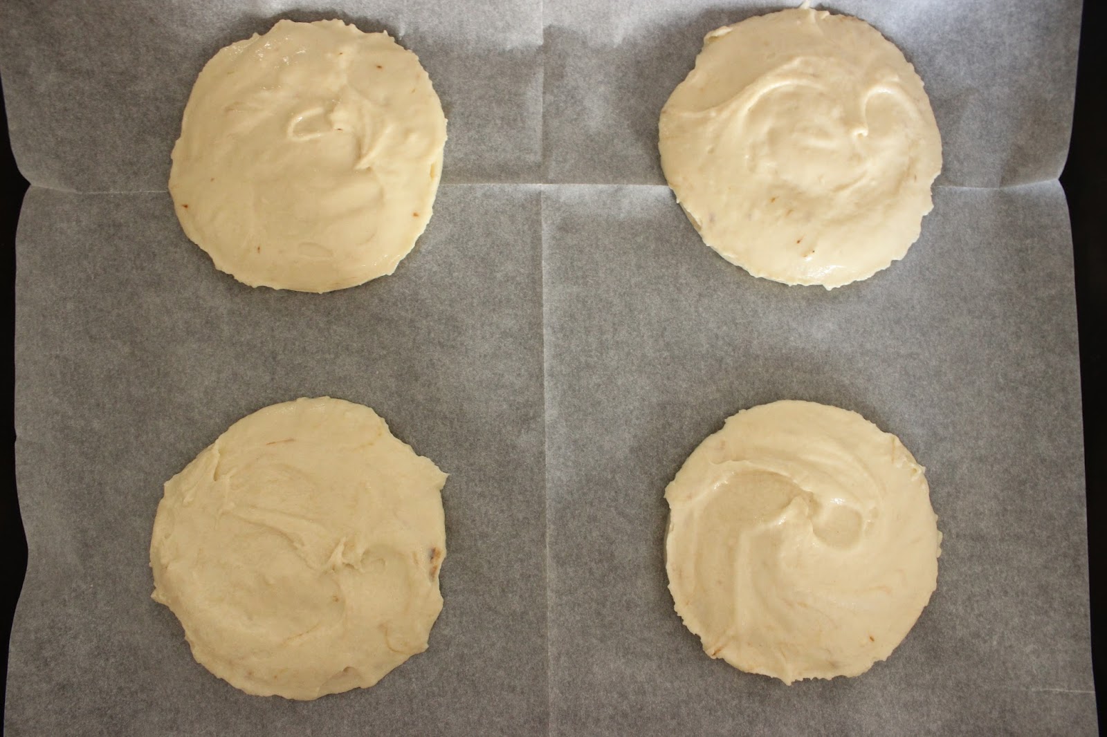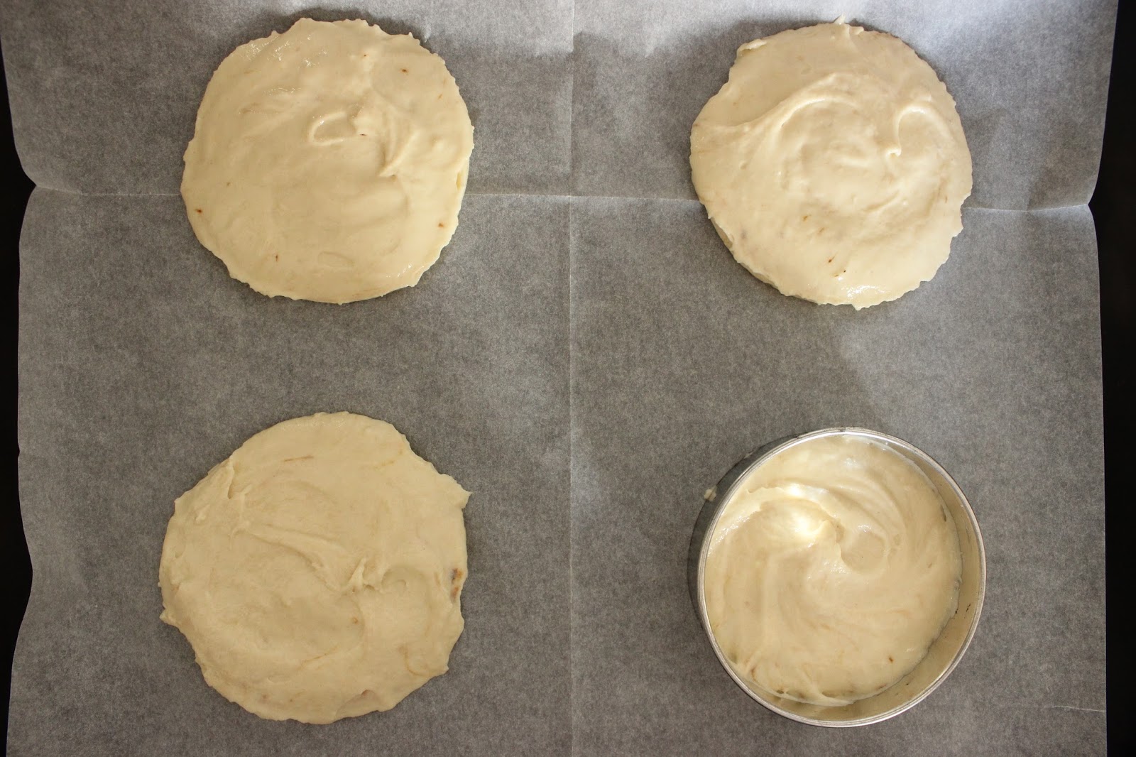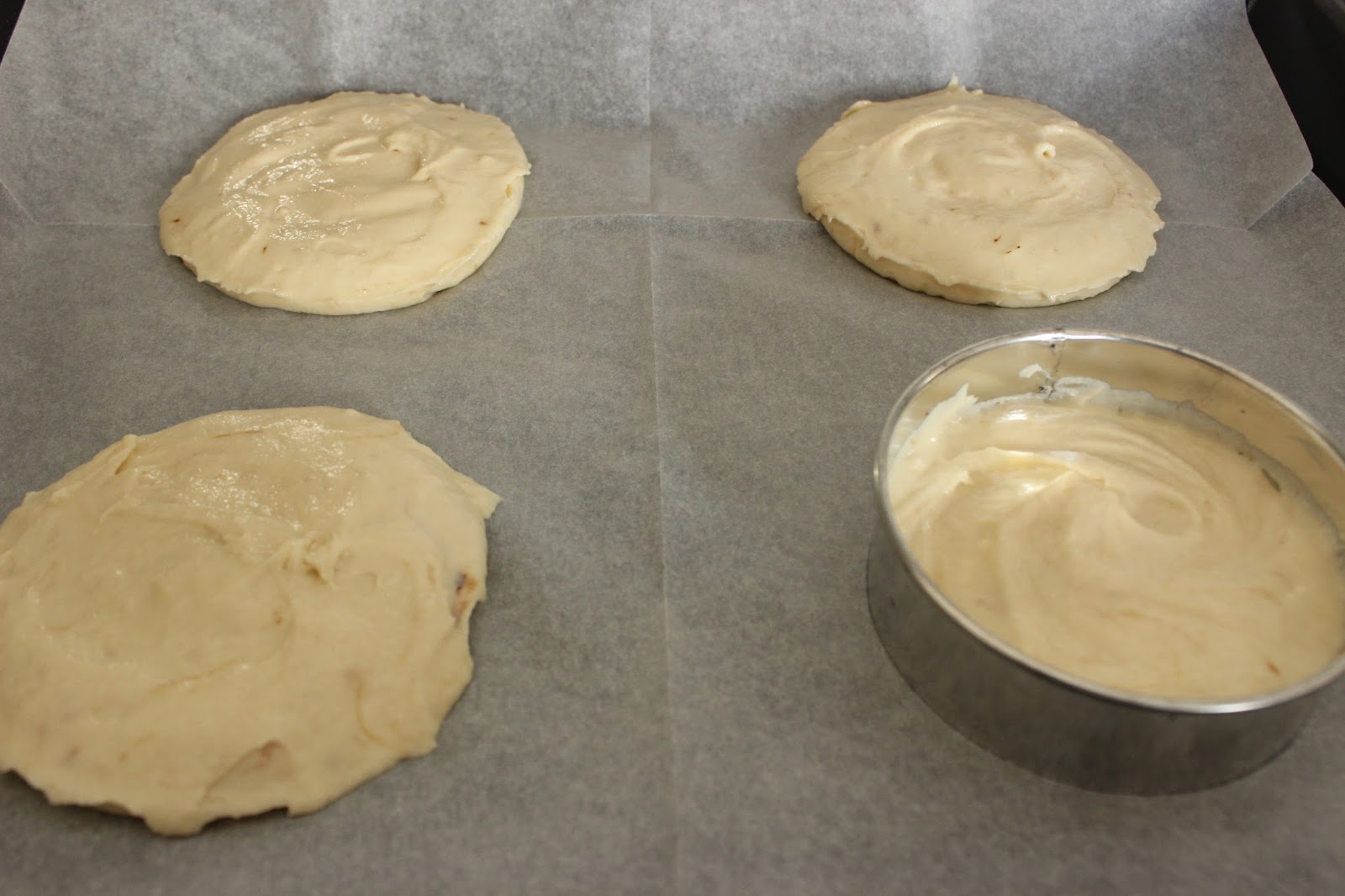 7. מניחים חותכן עגול/רינג בגודל הרצוי (9 ס”מ במקרה שלי) בתבנית ומניחים בתוכו שתיים-שלוש כפות בלילה. משטחים את הבלילה בתוך החותכן בעזרת לקקן/פלטה/כפית, עד לקבלת עיגול.