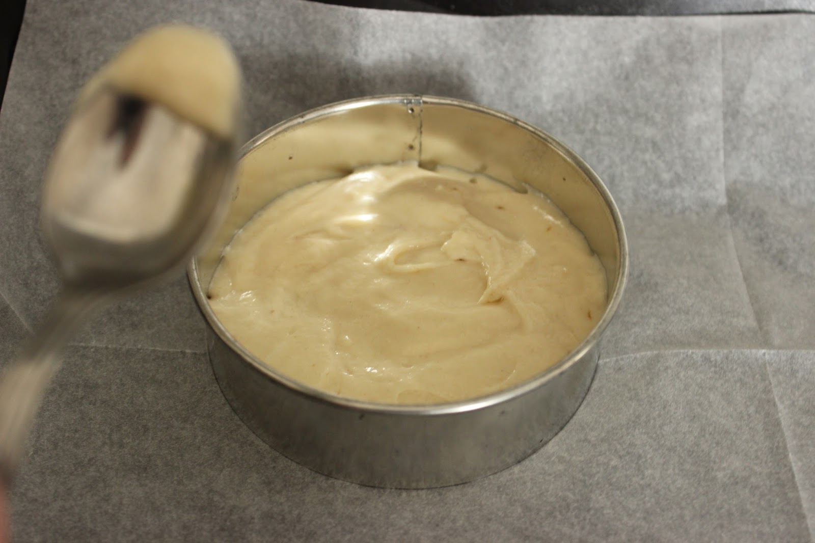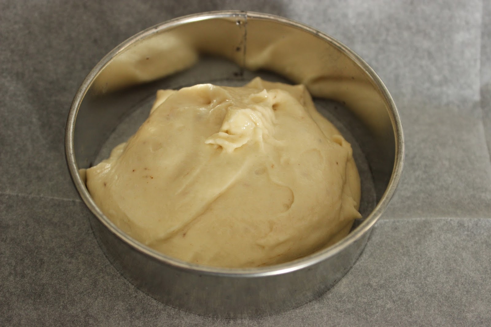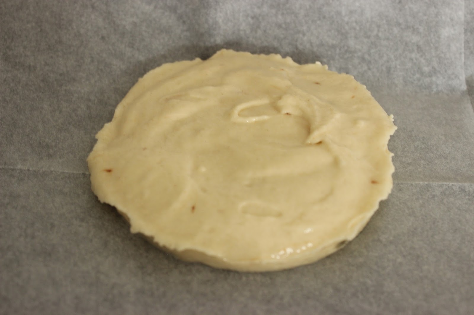 7. מניחים חותכן עגול/רינג בגודל הרצוי (9 ס”מ במקרה שלי) בתבנית ומניחים בתוכו שתיים-שלוש כפות בלילה. משטחים את הבלילה בתוך החותכן בעזרת לקקן/פלטה/כפית, עד לקבלת עיגול.