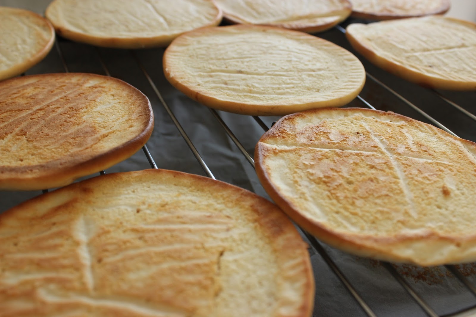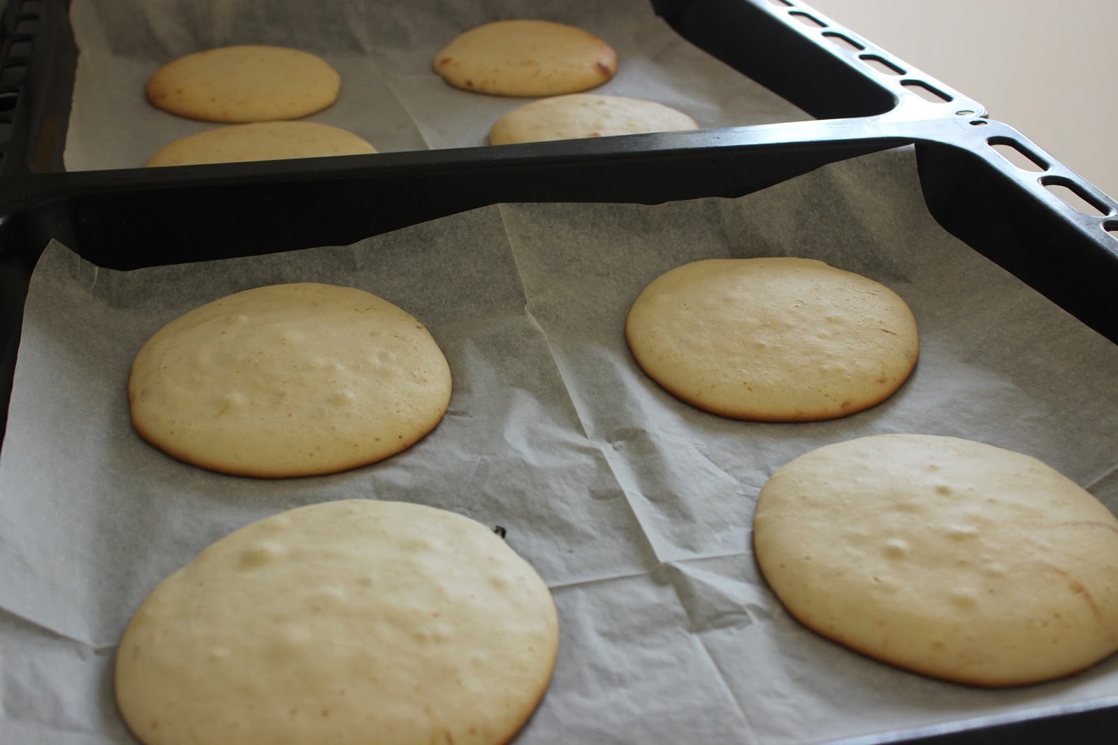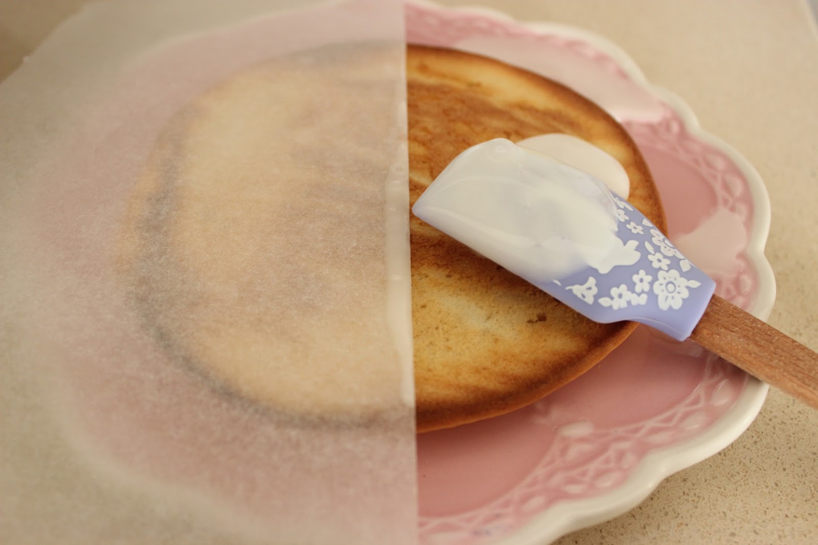11. מורחים את הציפוי על חצי מכל עוגיה הפוכה (כך שהחלק העליון כלפי מעלה! אני התבלבלתי בעוגיה אחת, וזה היה הרבה פחות נוח לעבוד עם העוגיה ככה) בעזרת לקקן/פלטה. לגבי איך שומרים שזה באמת יהיה ישר וזה – אני הנחתי חתיכה של נייר אפיה על חצי עוגיה, וציפיתי עד אליה, וקצת גם מעליה. אתם יודעים, כמו כשצובעים קיר (אמרה הבחורה שמעולם לא צבעה קיר).