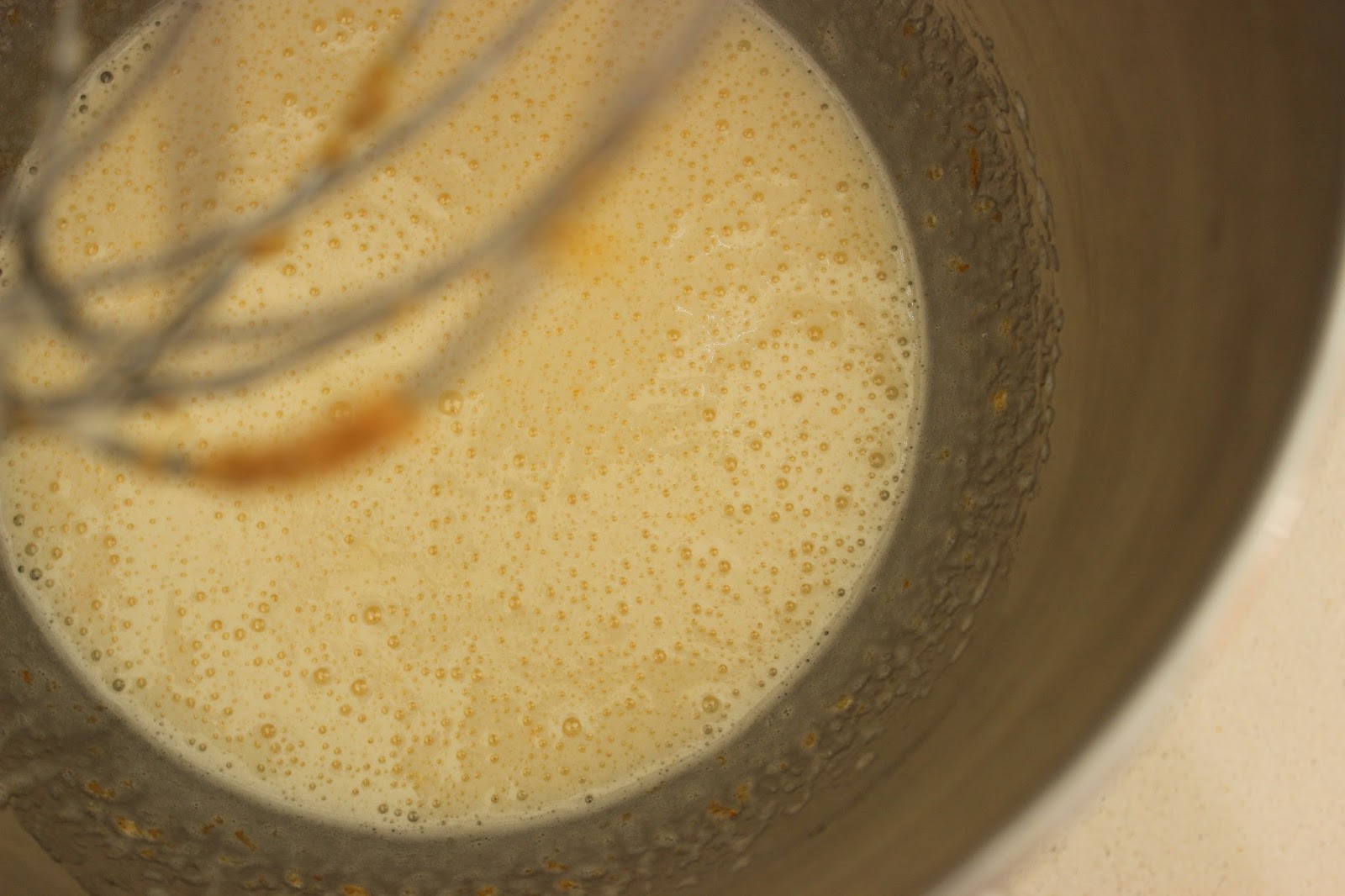 3. מניחים ביצים וסוכר תפוזי בקערת המיקסר. מחברים וו בלון ומקציפים היטב, על מהירות בינונית-גבוהה, עד לקבלת תערובת בהירה ותפוחה.