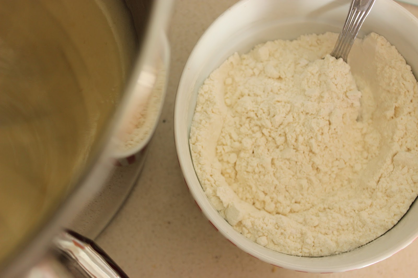 7. מפעילים שוב את המיקסר, על מהירות נמוכה, ומוסיפים חומרים יבשים לקערה בהדרגה, תוך כדי ערבוב.