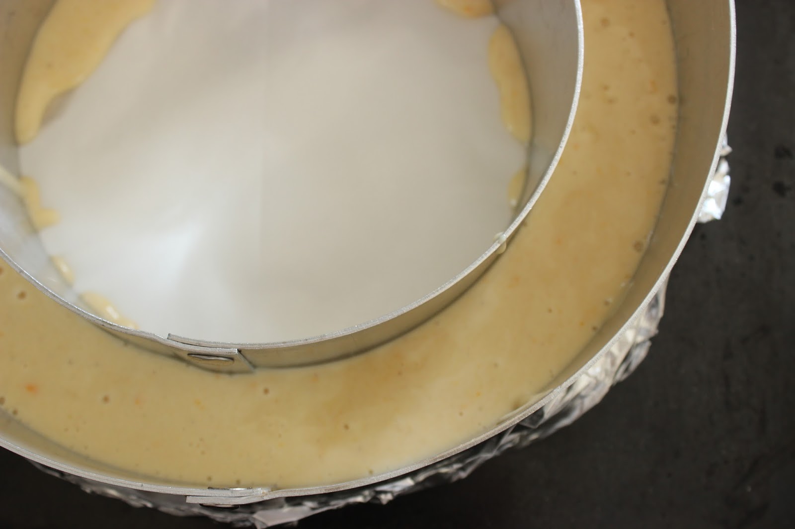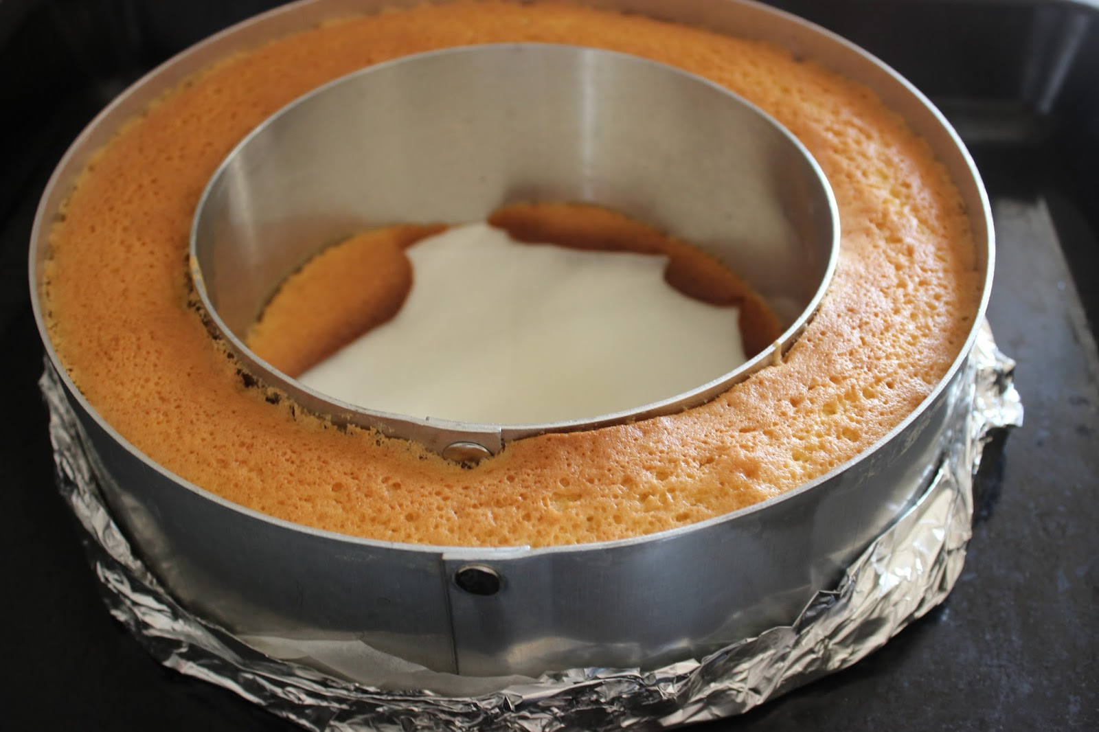 1. מחממים תנור ל-180 מעלות. משמנים תבנית עגולה בקוטר 24 ס”מ ומניחים בתוכה תבנית קטנה יותר, בקוטר 16/18 ס”מ. כמובן שאפשר גם להשתמש בתבנית קוגלהוף.