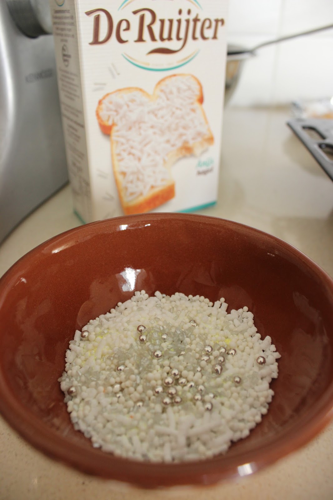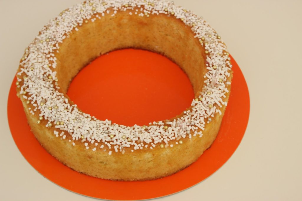 התחלתי עם זה שאני רוצה להכין עוגה בצורת טבעת מנצנצת. אז הנחתי רינג בתוך רינג, כדי שהעוגה תצא דקה יחסית, כמו טבעת. ואספתי את כל הסוכריות הלבנות-כסופות-זהובות-מנצנצות שהיו לי בבית, לטובת הקישוט. כולל הפצפוצים הלבנים של De Ruijter שקניתי בהולנד, אלה שרק אחרי שקניתי אותם גיליתי שהם למעשה פצפוצי אניס (אנ-איכס).