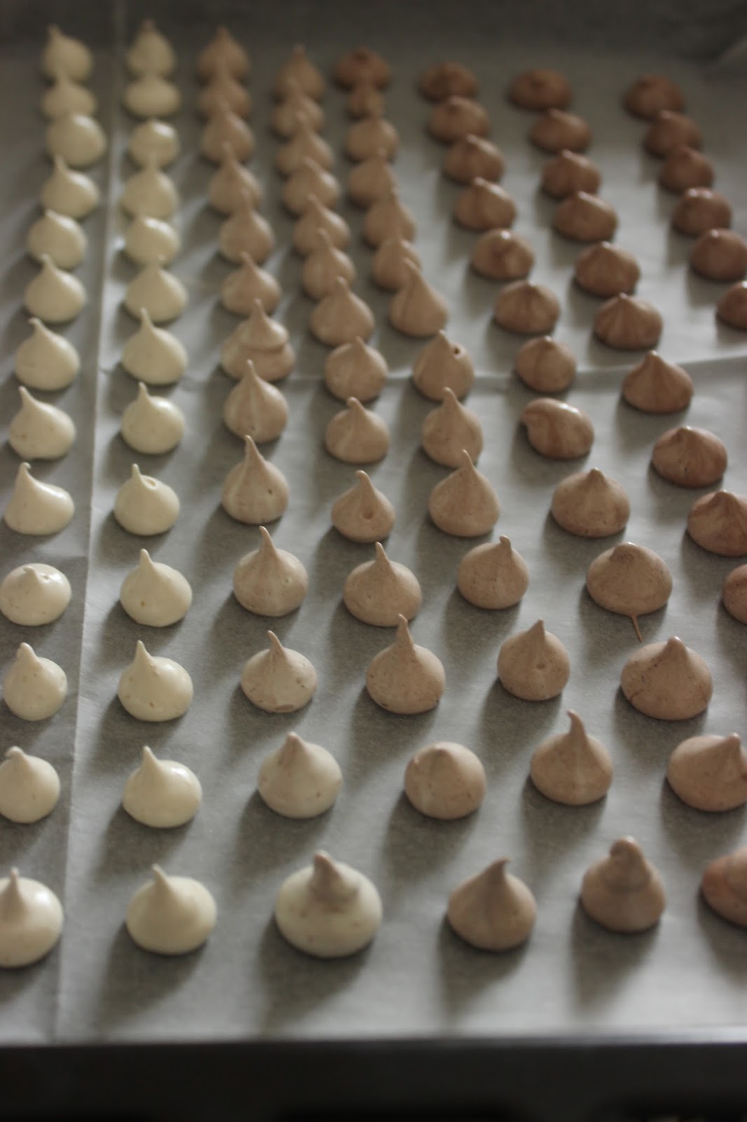 לא נורא, חשבתי במהלך האפיה, אשתמש רק בנשיקות המרנג הבהירות יותר. את הכהות אפורר ואניח בין שכבות העוגה או משהו.