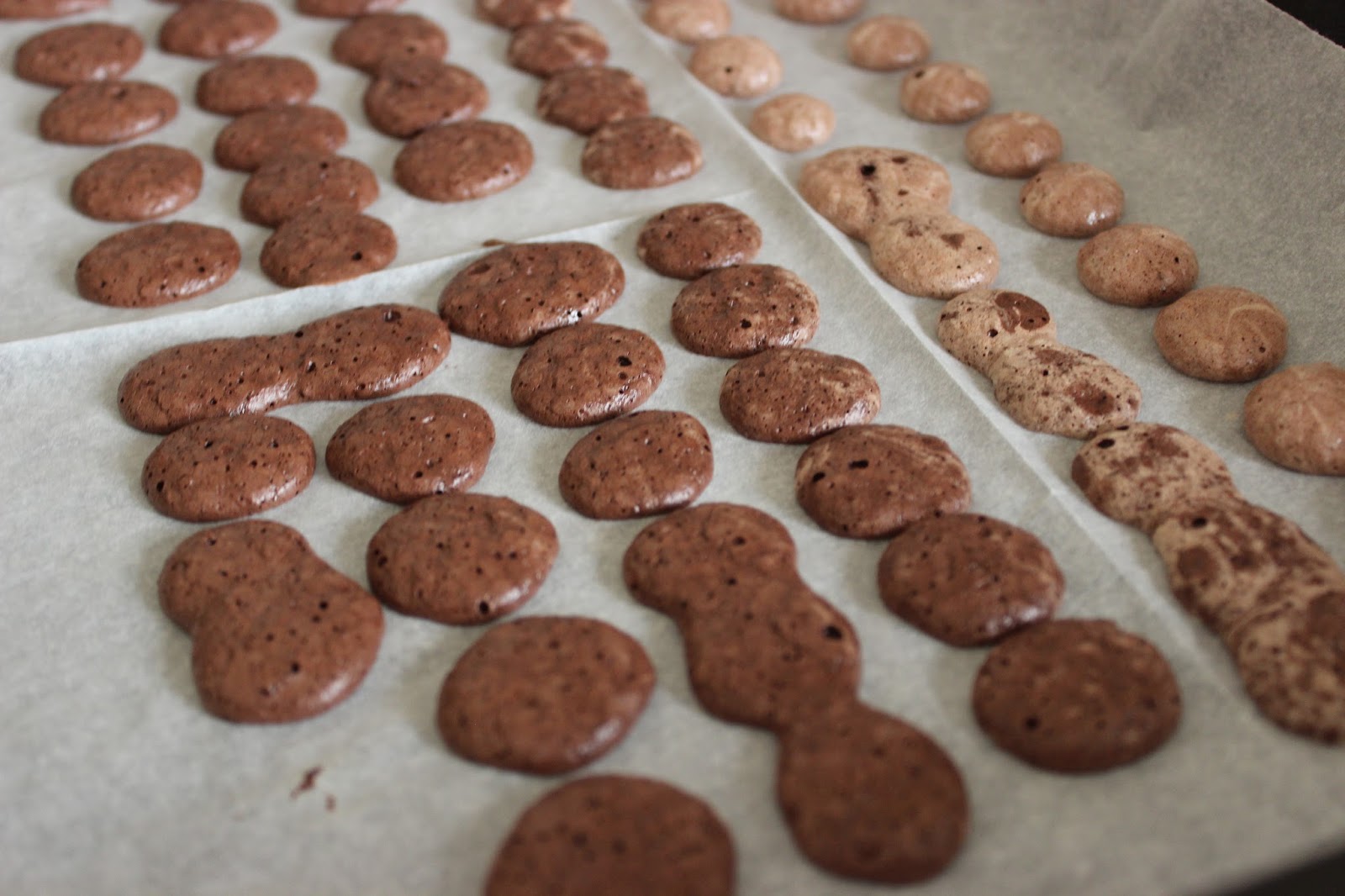 תבנית אחת עוד יצאה “סביר” מבחינה ויזואלית. התבנית השניה היתה הרוסה עוד לפני האפיה – מה שקרה זה שהתחלתי עם מרנג לבן, ובהדרגה הוספתי לו עוד ועוד קקאו, על מנת להכהות אותו. העניין הוא שאחרי כמה הוספות, המרנג הסופר-יציב שלי הפך לשלולית חומה ובלתי ניתנת לזילוף. עצב. עצב רב.