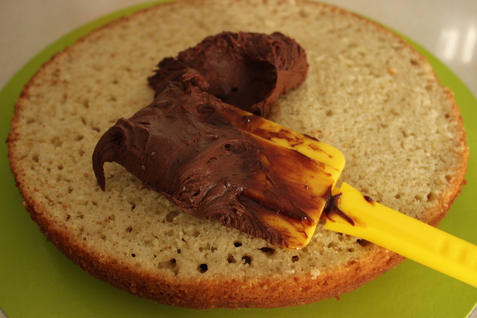 7. כאשר העוגה קרה לגמרי, מחלצים מהתבנית. מיישרים את חלקה העליון (מעקמים, אם אתם אני..) ופורסים לשתי שכבות שוות עד כמה שניתן.
