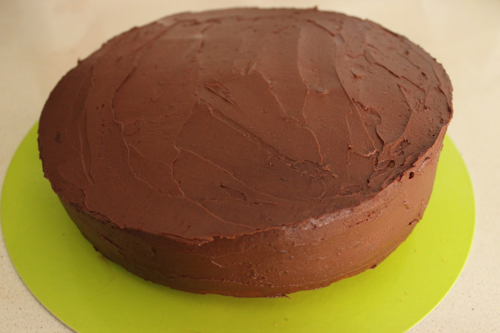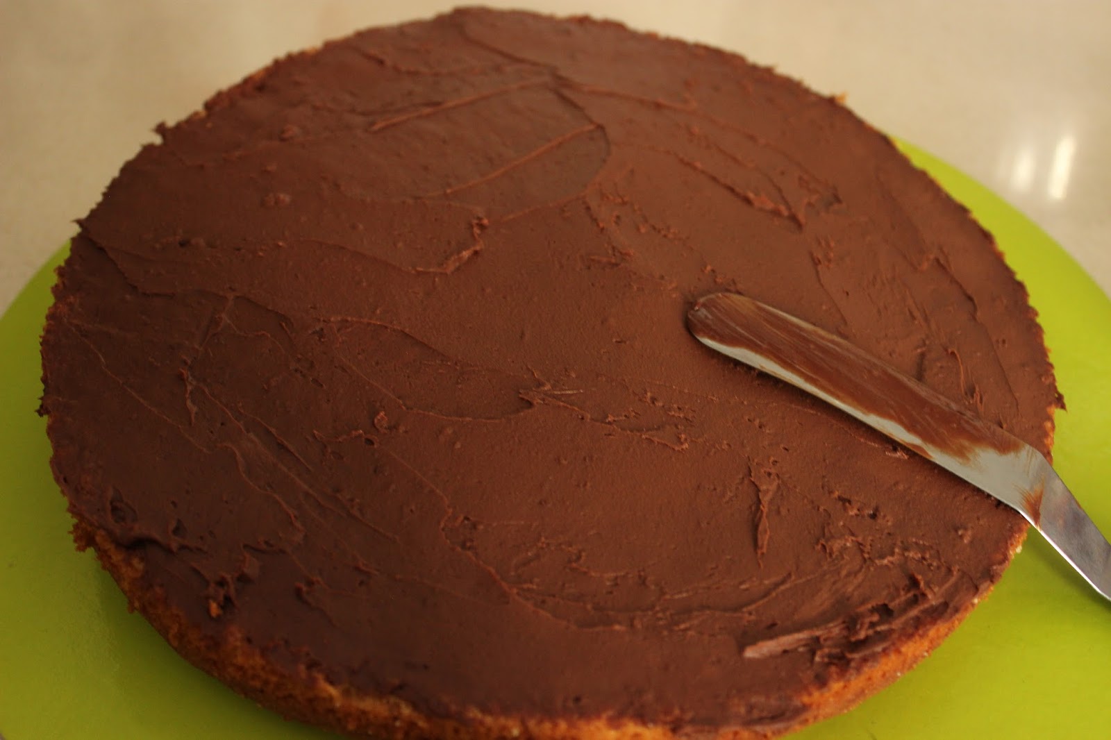 10. מניחים את פרוסת העוגה השניה מעל הראשונה. מצפים את חלקה העליון של העוגה ואת הצדדים בגנאש מוקצף. מיישרים עד כמה שמתאפשר.