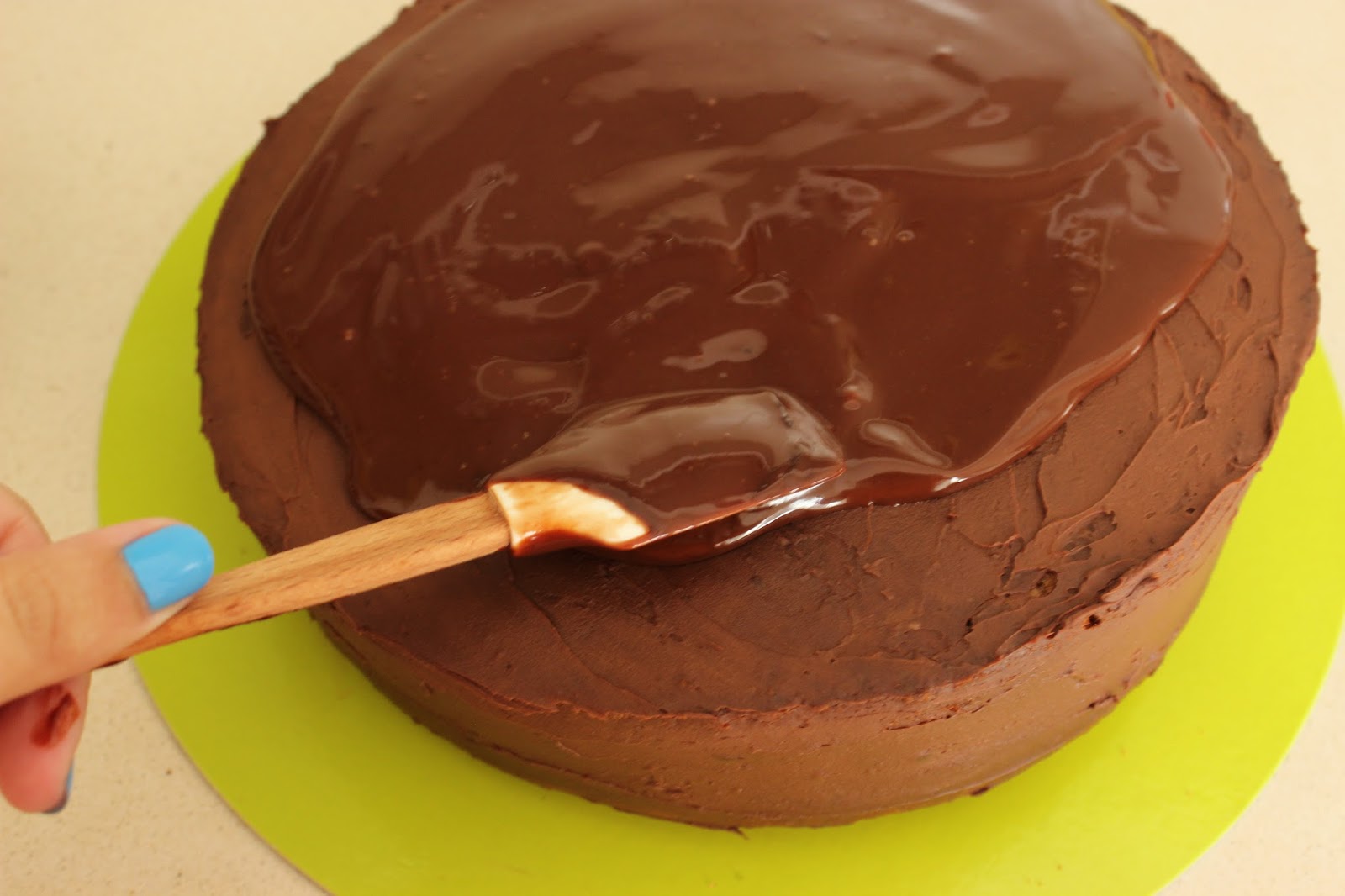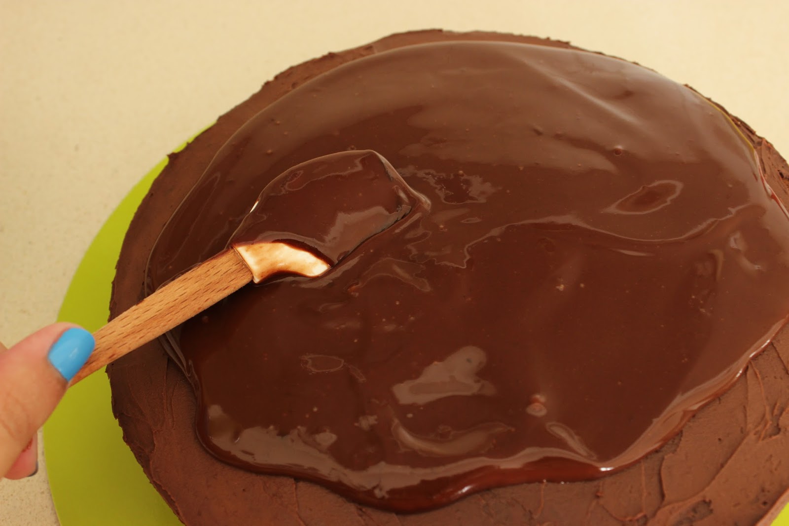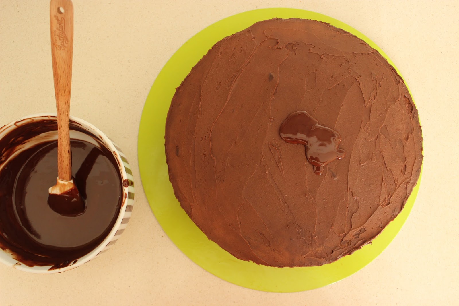 12. יוצקים את הגנאש מעל העוגה באיטיות. אם צריך, עוזרים לו להגיע לכל חלקה העליון של העוגה – ואולי לזלוג קצת לצדדים – בעזרת לקקן או פלטה קטנה.