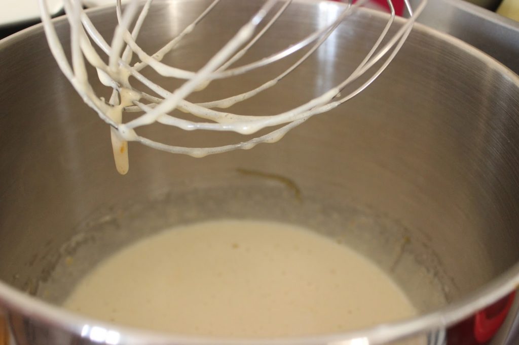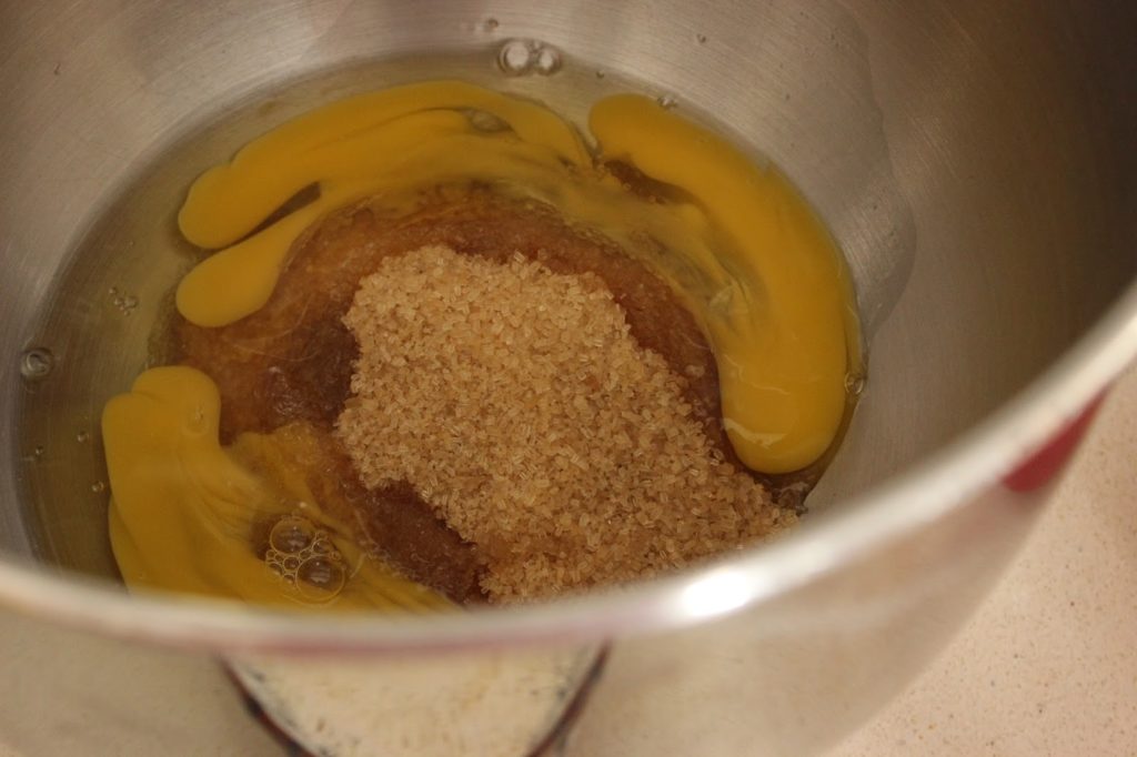 4. מניחים ביצים וסוכר חום בקערת המיקסר. מחברים וו בלון ומקציפים על מהירות גבוהה למשך שלוש-ארבע דקות, עד לקבלת קצף שווה כזה, או פשוט תערובת תפוחה וקרמית.