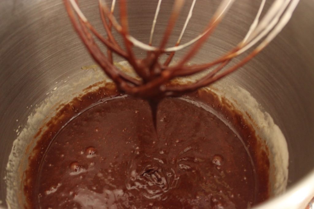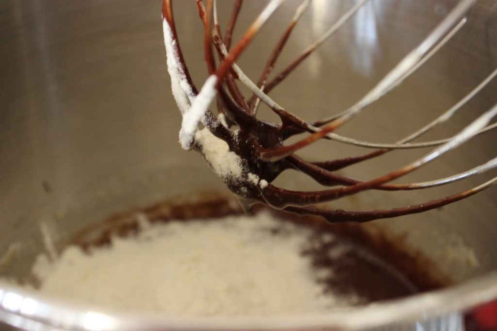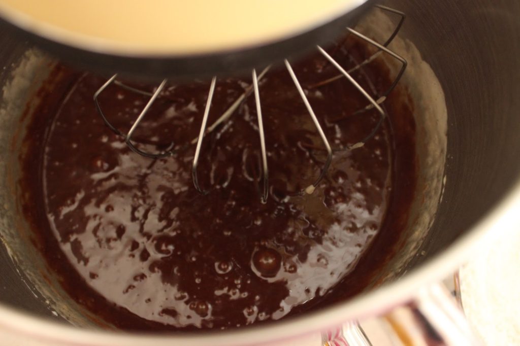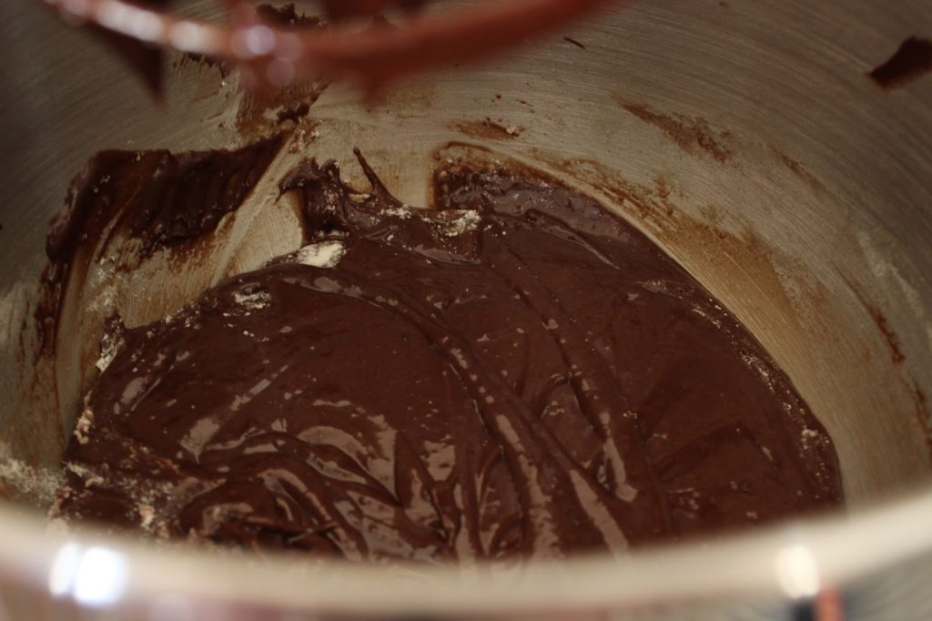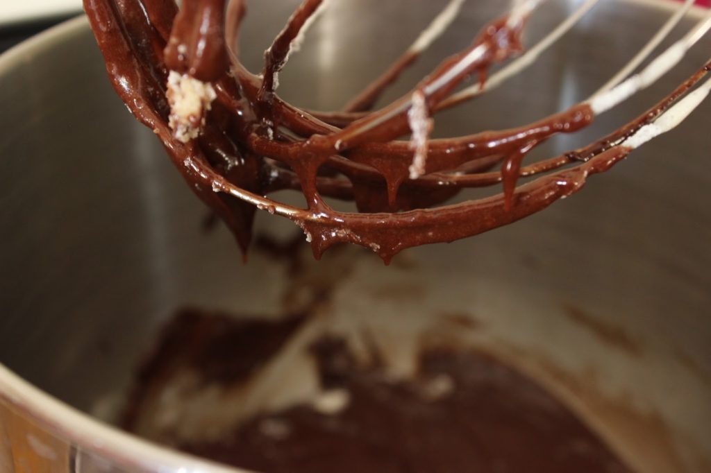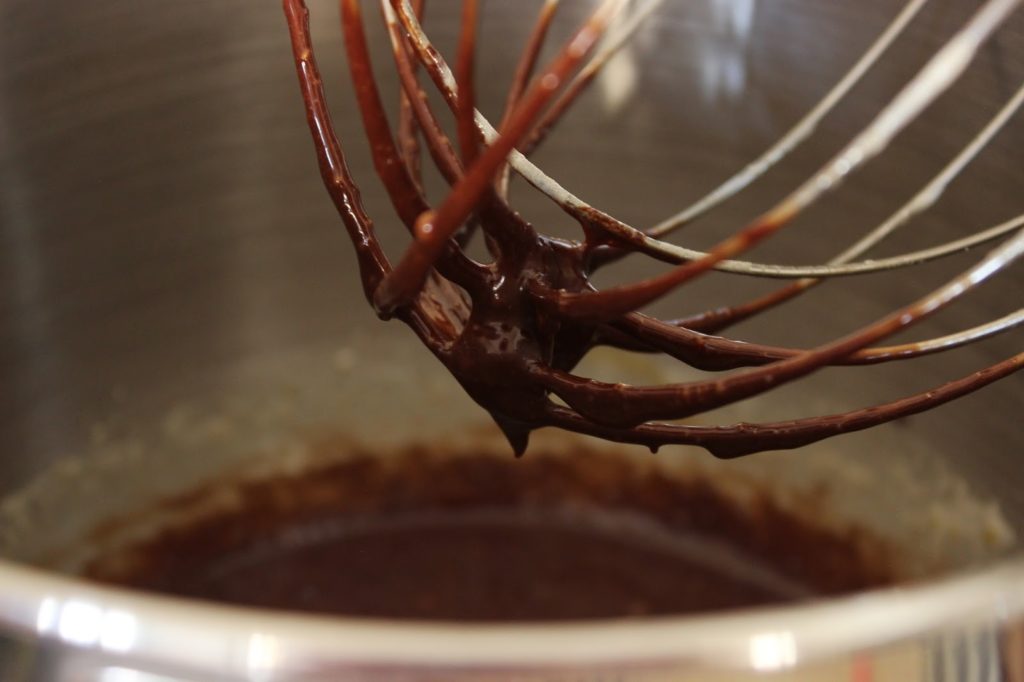 5. מנמיכים את מהירות המיקסר ומוסיפים שוקולד וחמאה מומסים.
