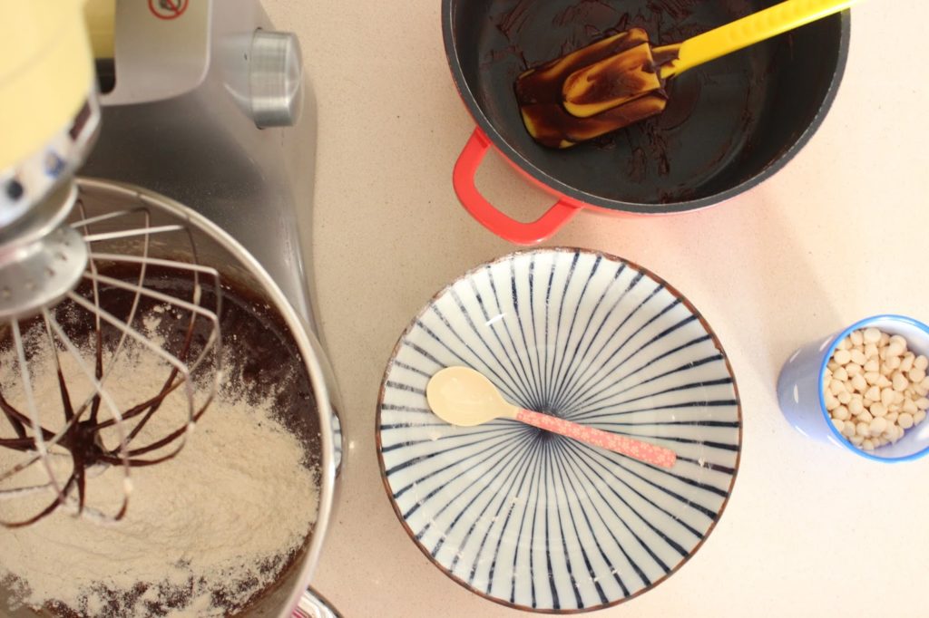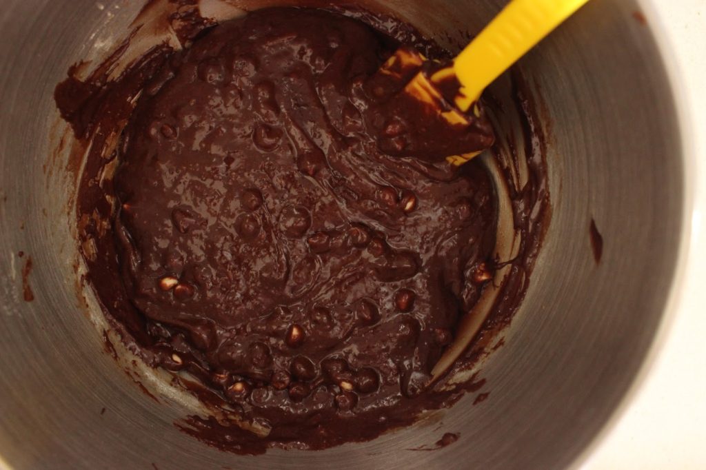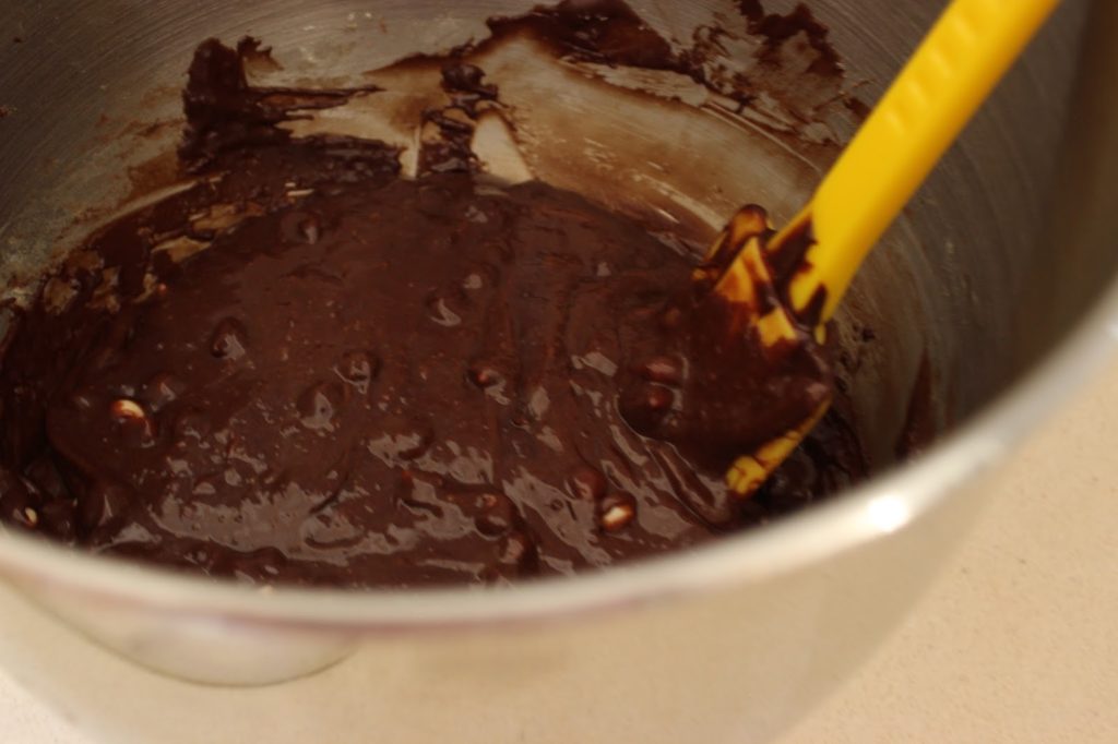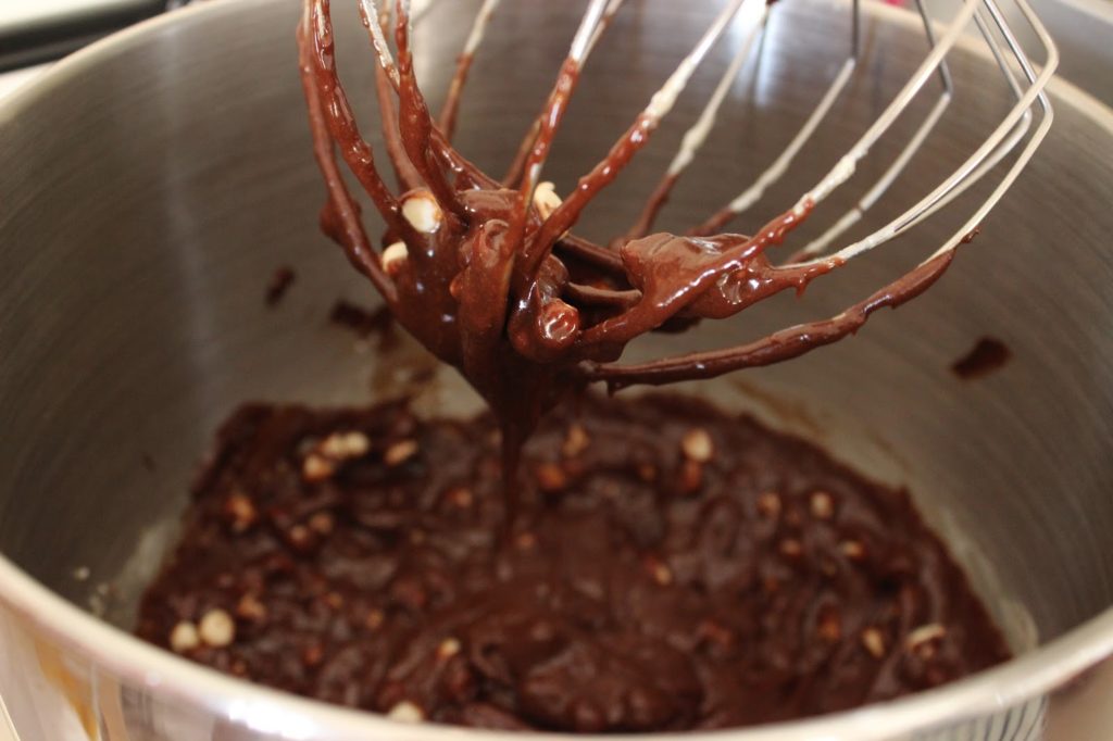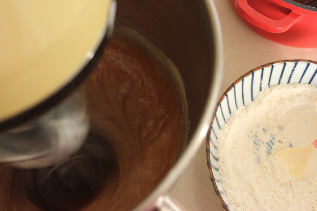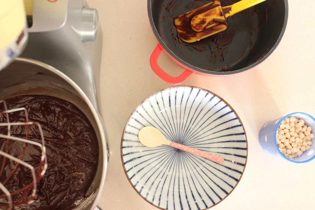 5. מנמיכים את מהירות המיקסר ומוסיפים שוקולד וחמאה מומסים.