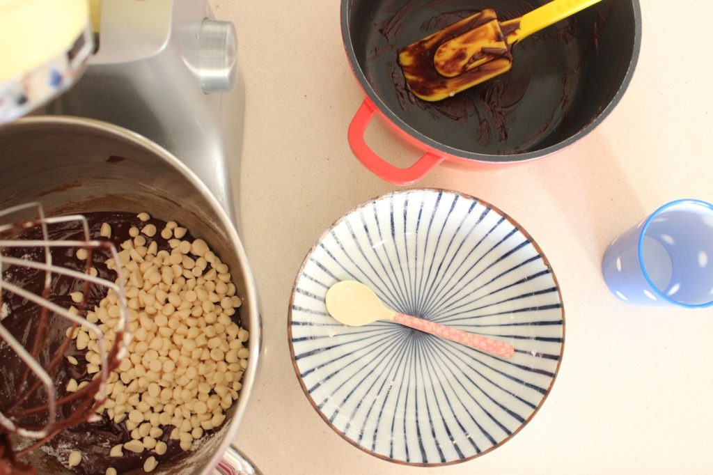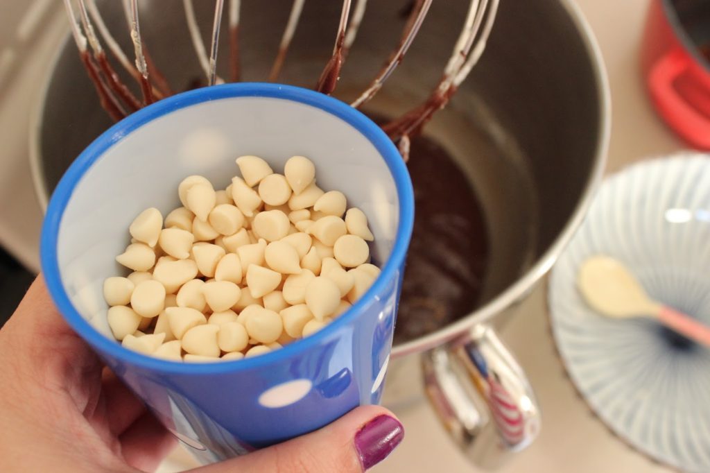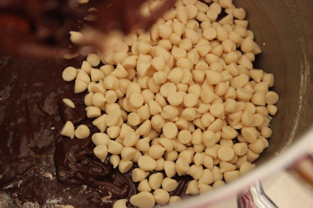 7. מוסיפים שוקולד לבן ומערבבים רק עד לפיזור אחיד.