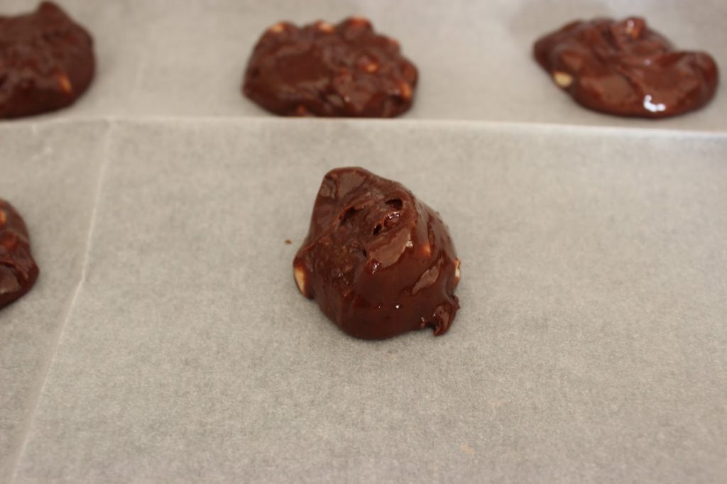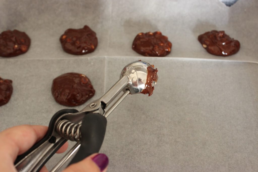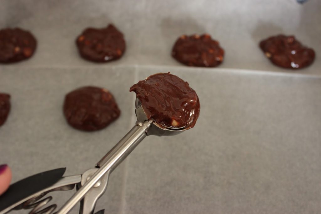 8. בעזרת כף גלידה קפיצית, או סתם כף/כפית, מניחים עוגיות בתבנית. מקפידים לשמור על מרווח של מספר סנטימטרים, כיוון שהעוגיות מתפשטות במהלך האפיה.