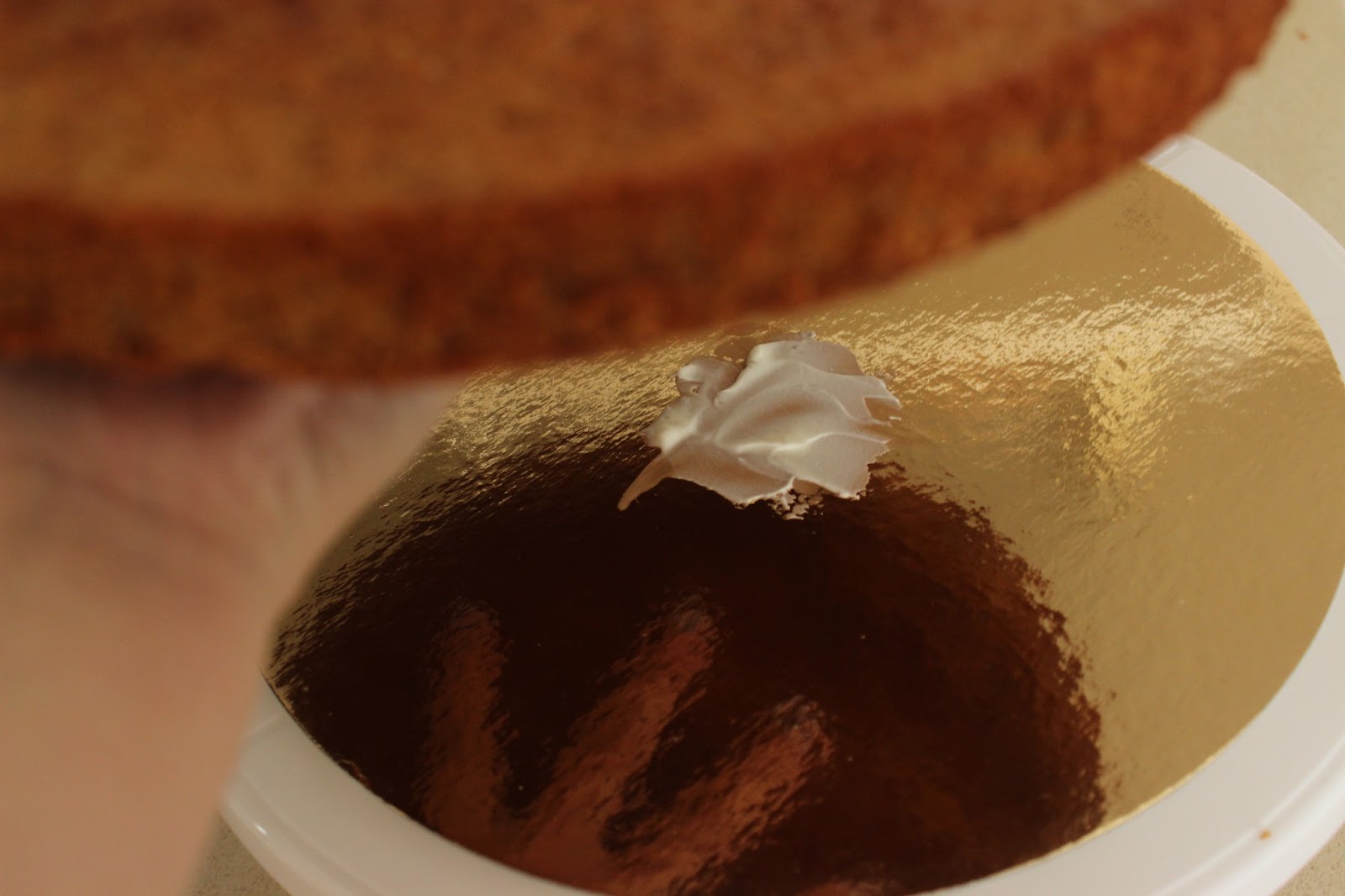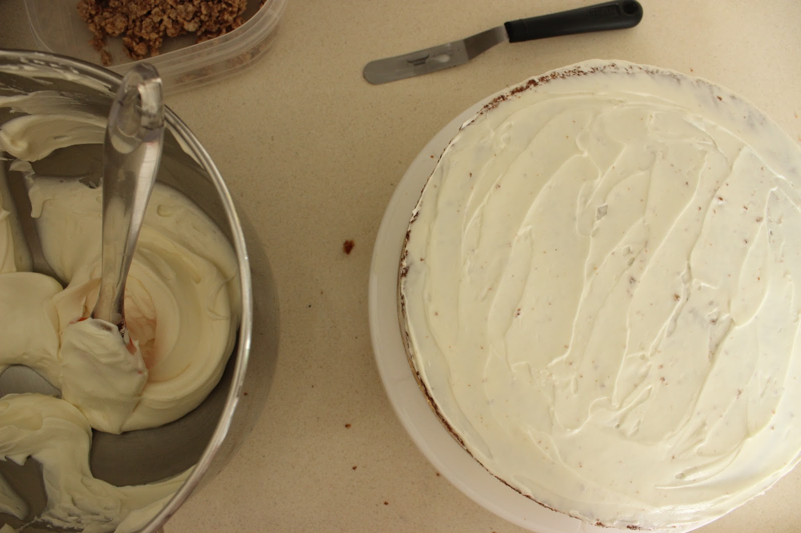 16. מניחים את השכבה השניה של העוגה, ומצפים את העוגה כולה בקרם – אפשר להסתפק במראה חצי עירום, אבל אם רוצים לצפות את העוגה לגמרי, רצוי לעשות ציפוי פירורים, להעביר למקרר לרבע שעה-עשרים דקות, ולאחר מכן לצפות בשכבה נוספת של קרם.