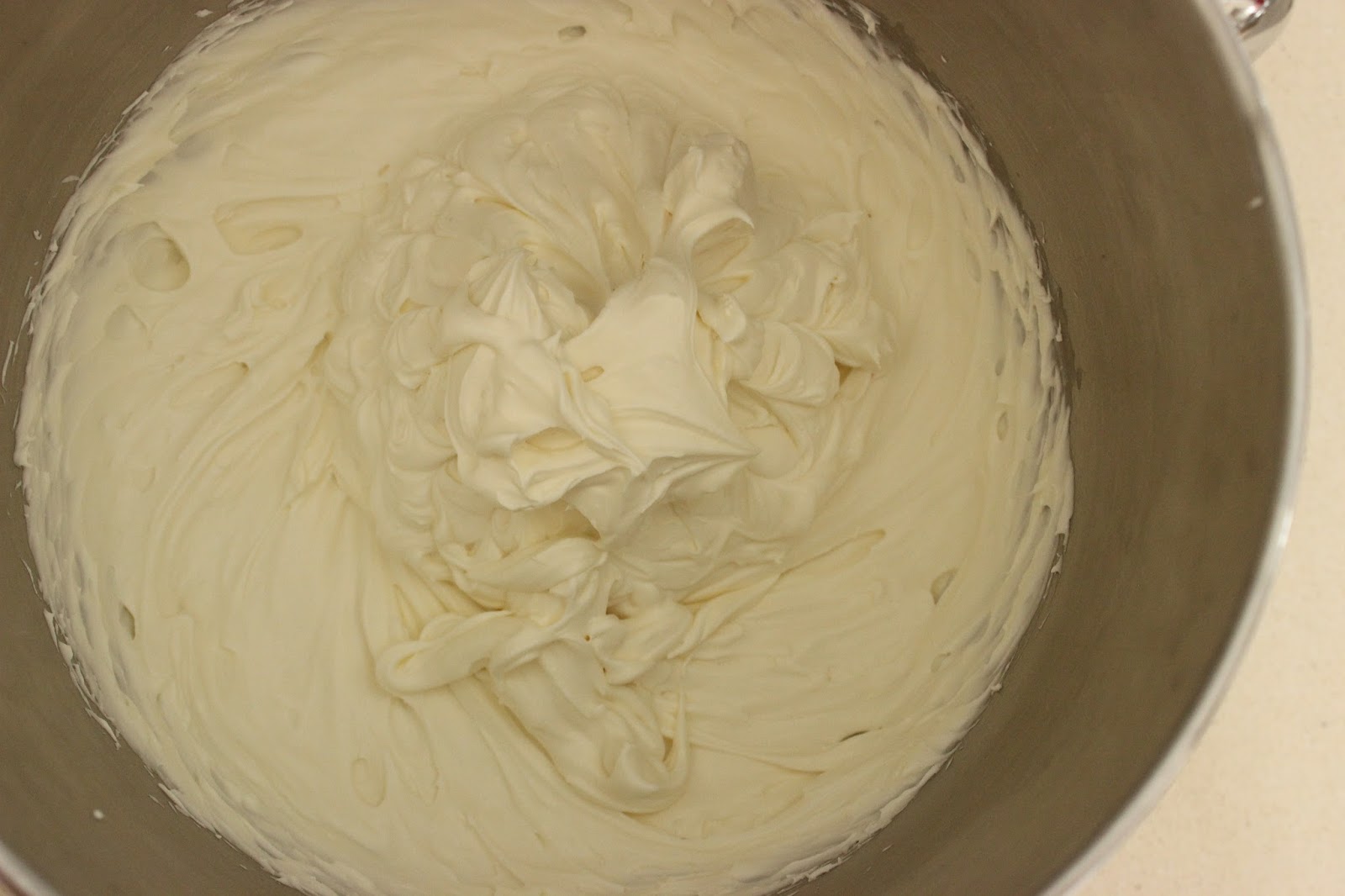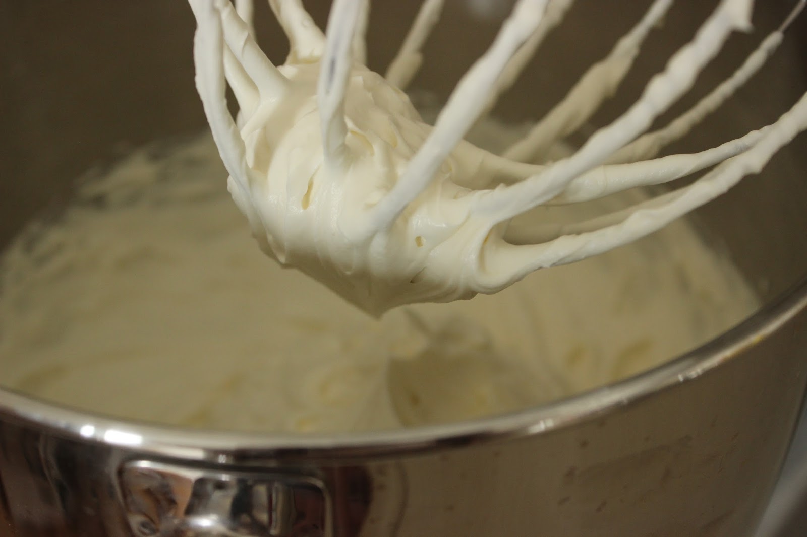14. מסיימים את הכנת קרם השוקולד הלבן: מניחים את הגנאש בקערת המיקסר, יחד עם שאר השמנת המתוקה (250 מ”ל). מחברים וו בלון ומקציפים לקרם יציב.