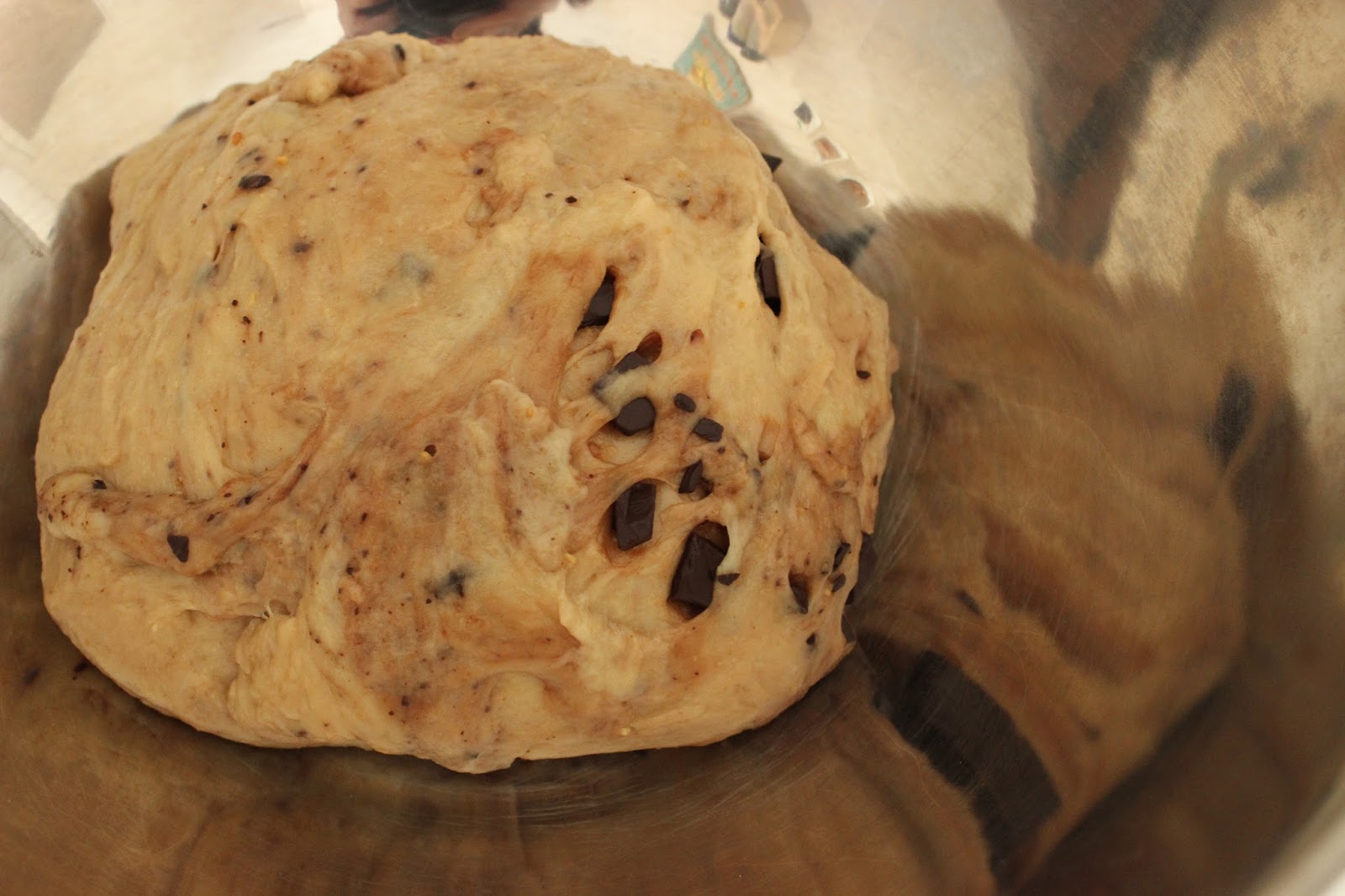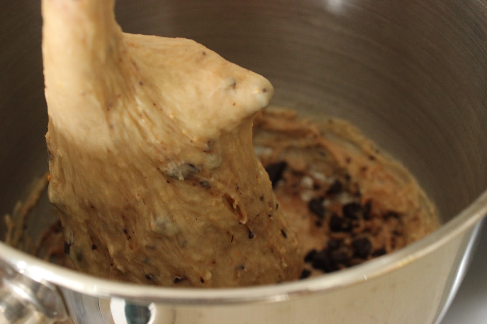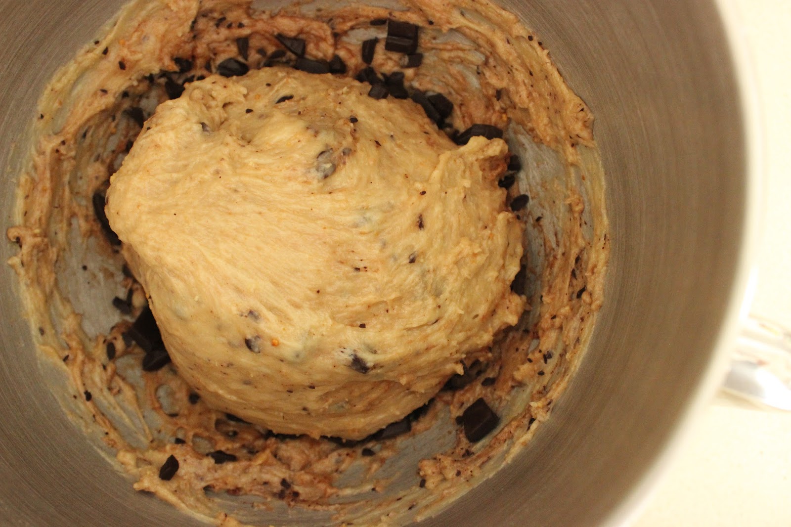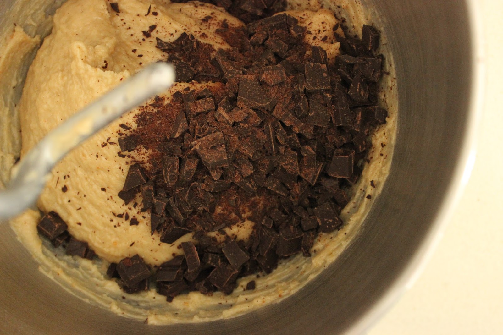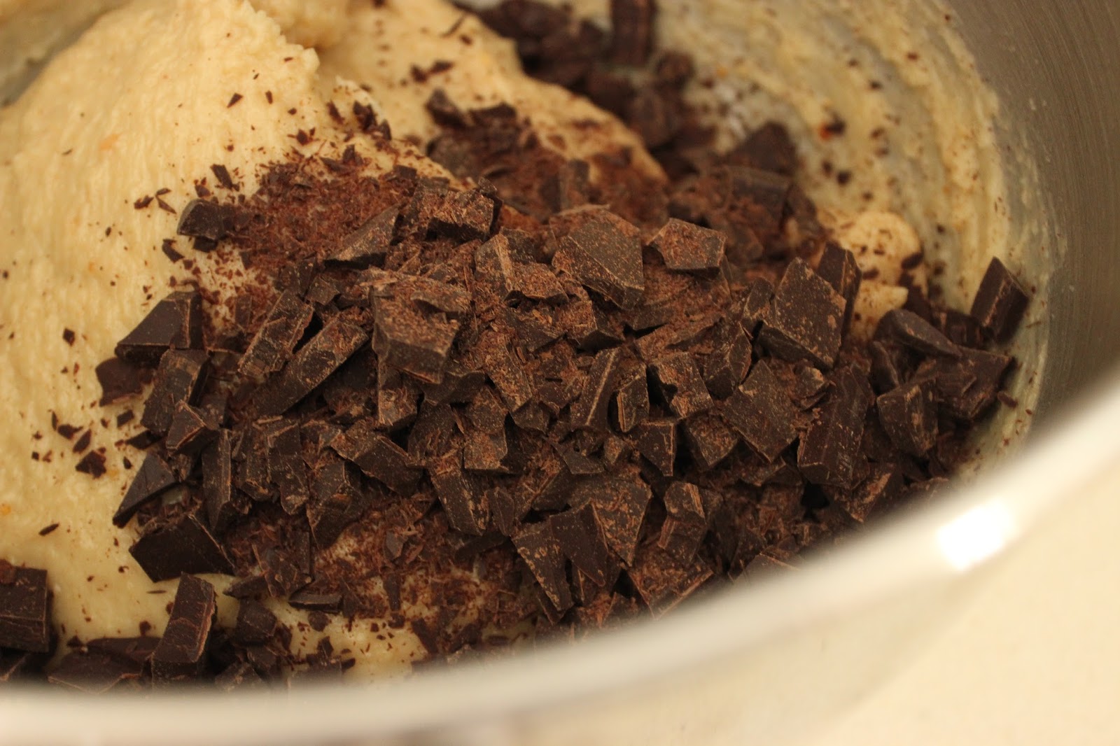 2. מוסיפים שוקולד קצוץ ומערבבים ערבוב קצר, רק עד לפיזור אחיד של השוקולד בבצק.