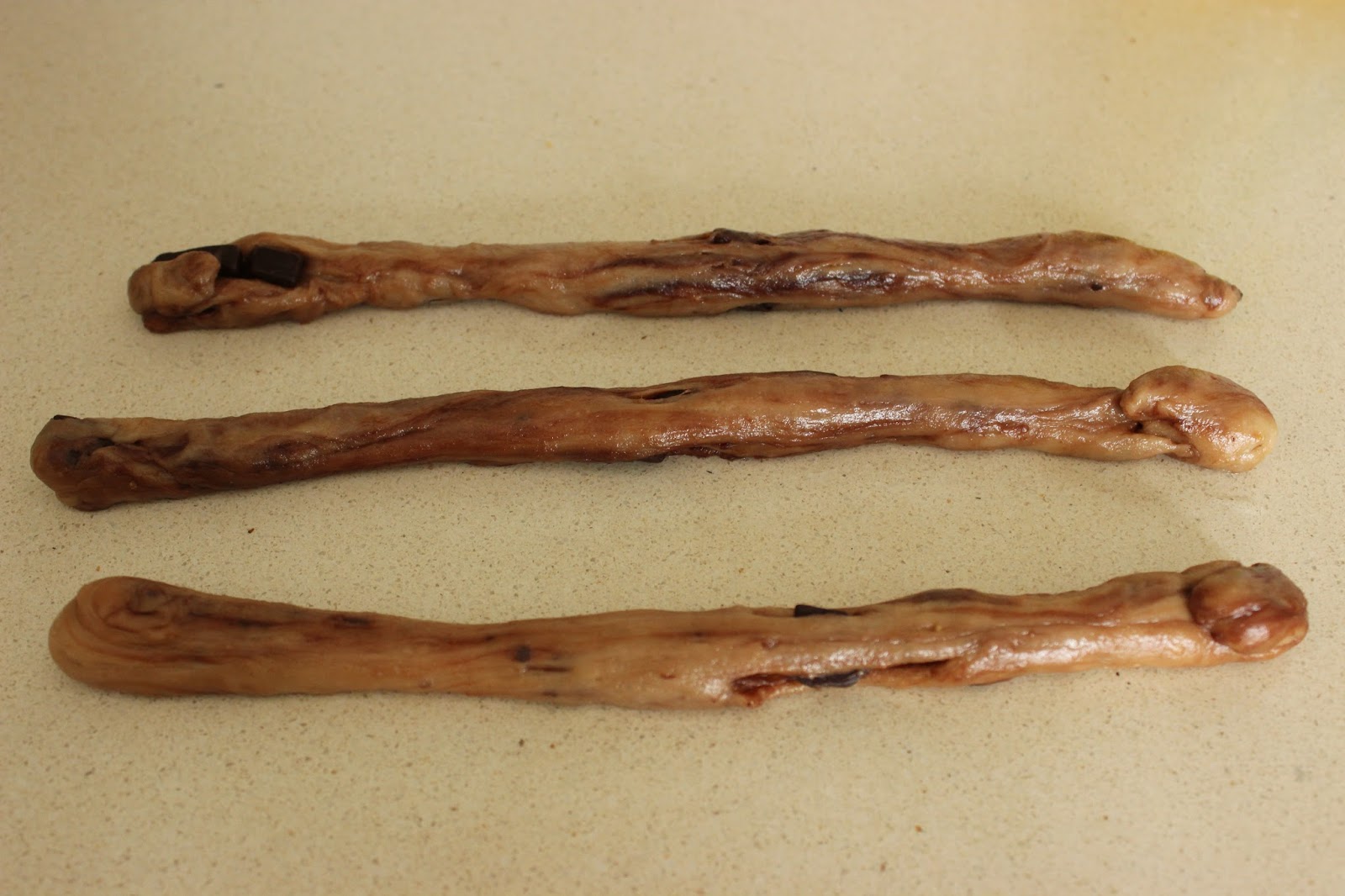 4. מניחים על משטח מקומח קלות. מחלקים לעשרים-עשרים ארבע חתיכות שוות גודל (תלוי כמה מאפים תרצו לקבל, ראו הערה שלי בהמשך). מעבדים כל חתיכה לכדור ומגלגלים לגליל באורך של 25-30 ס”מ.
