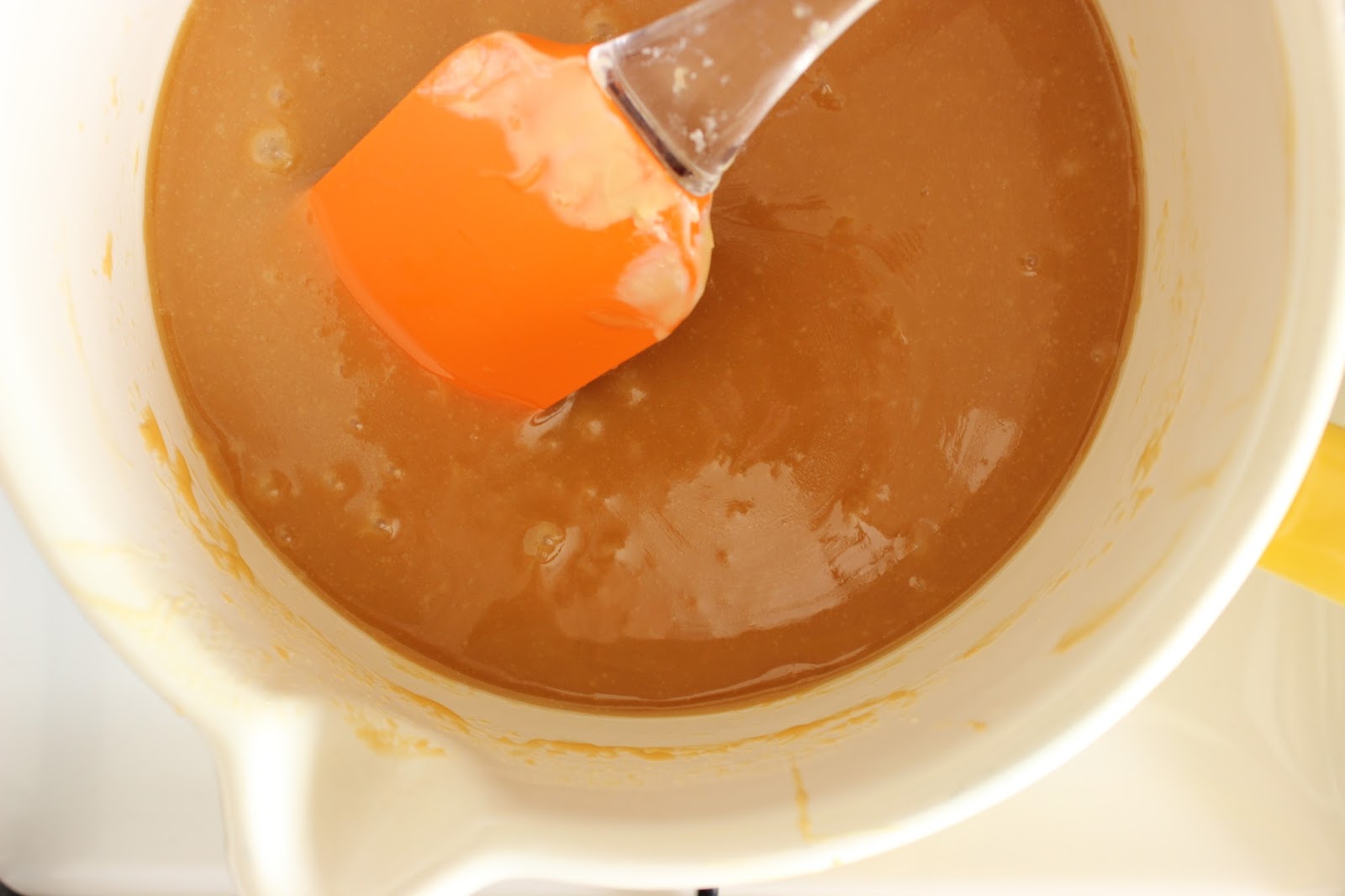 5. מוסיפים חמאה לשוקולד הלבן המקורמל. מחממים על אש בינונית, תוך כדי ערבוב, עד להמסה מלאה וקבלת תערובת חלקה. מצננים מספר דקות. שימו לב: יכול להיות שתערובת השוקולד והחמאה תתפרק קצת אחרי שהיא תעמוד כמה דקות. אל דאגה, ערבוב קל של התערובת יהפוך אותה להיות חלקה שוב.