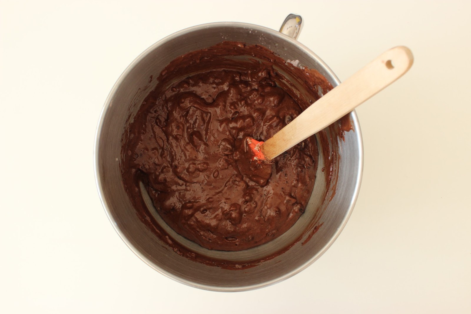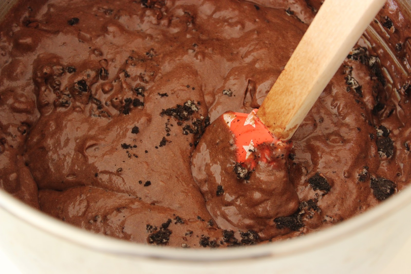 6. מקפלים פנימה אוראו (אפשר ידנית, בעזרת לקקן, בשלב זה, או על ידי ערבוב איטי וקצר במיקסר), ולאחר מכן שוקולד מריר קצוץ.