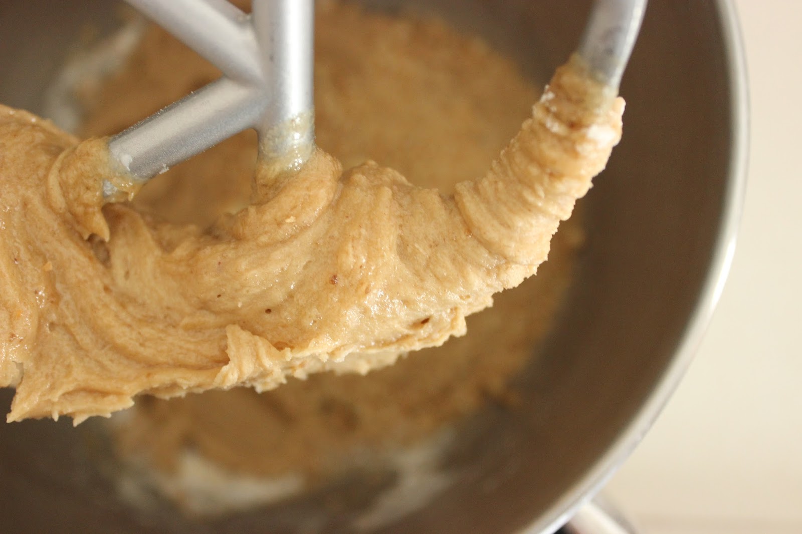 7. מניחים חמאה, חמאת בוטנים ושני סוגי סוכר בקערת המיקסר. מחברים וו גיטרה ומקרימים היטב על מהירות בינונית, למשך שלוש-חמש דקות.