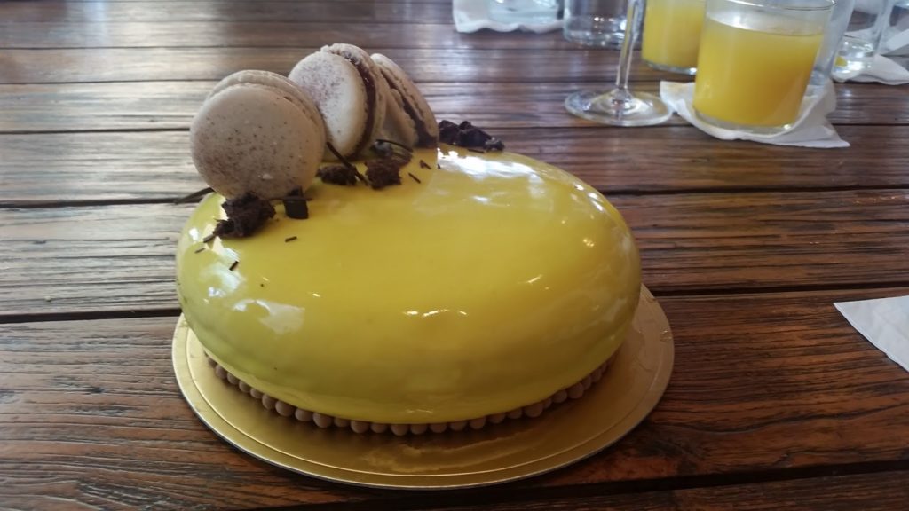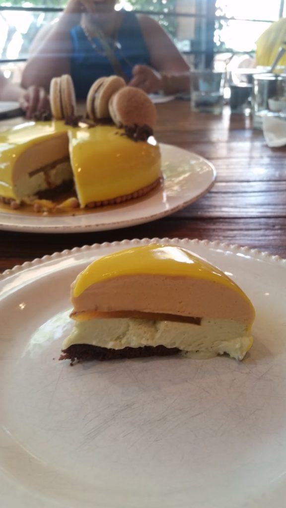 מוס שוקולד לבן מקורמל, מוס שוקולד לבן פיסטוק, שכבת ג’לי מנגו-פסיפלורה, מקרונים עם מילוי ג’אנדויה, קישוטי עוגת ספוג קקאו-שקדים ושוקולד מטומפרר. הכי בקטנה EVER.