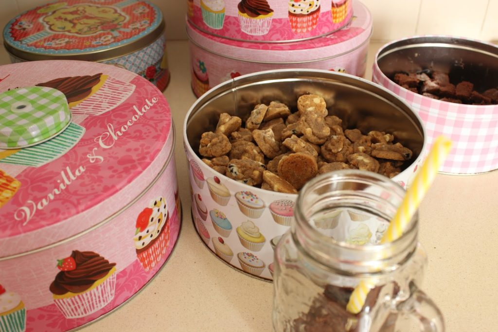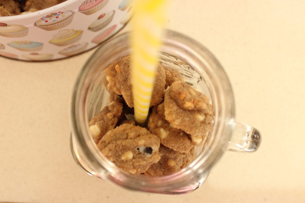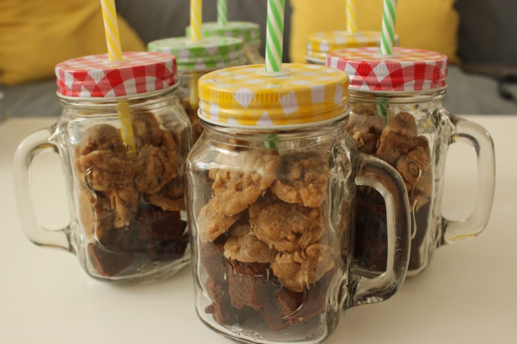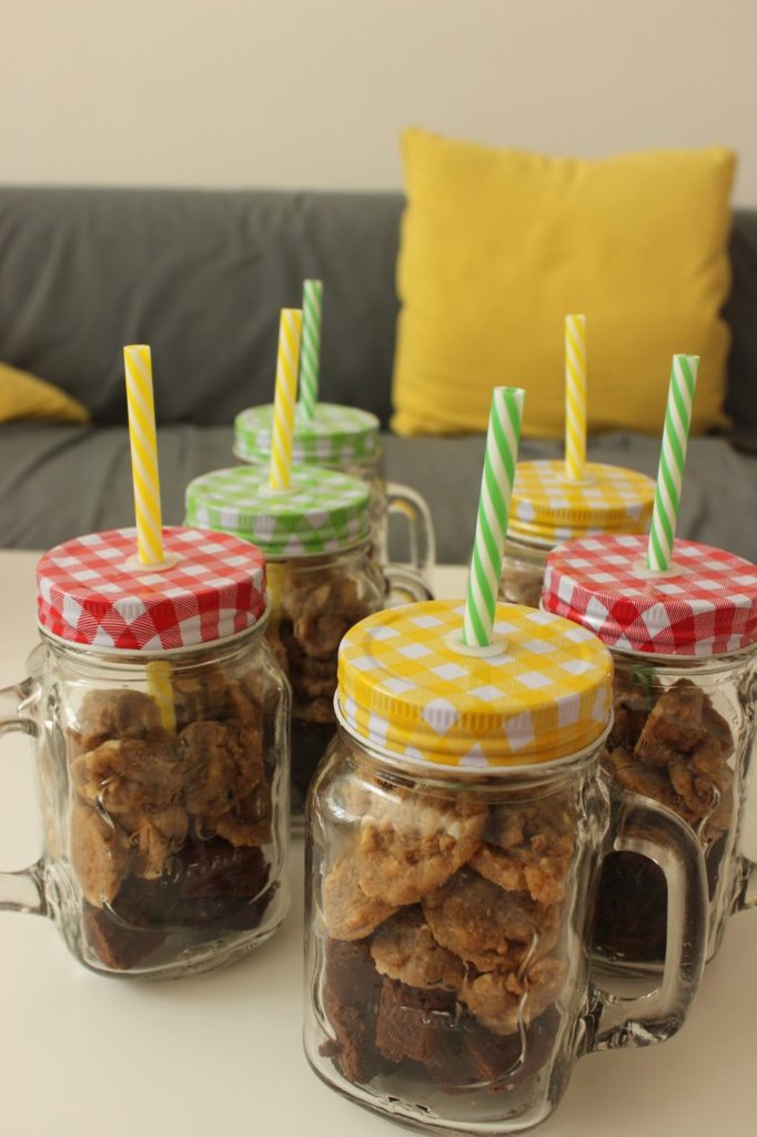* צנצנת מגניבה כזאת שמילאתי בקוביות בראוניז ובמיני-מיני עוגיות קפה ושוקולד לבן