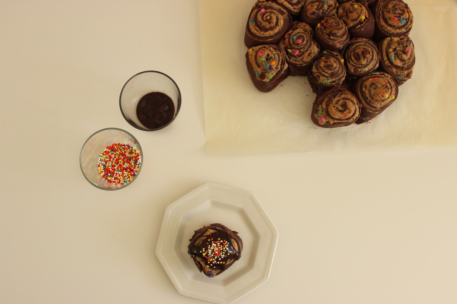 - וכן, קישטתי את אחת השושנים בגנאש שוקולד וסוכריות צבעוניות, כי כל דבר הופך לעוגת יום הולדת בעזרת קרם וסוכריות.