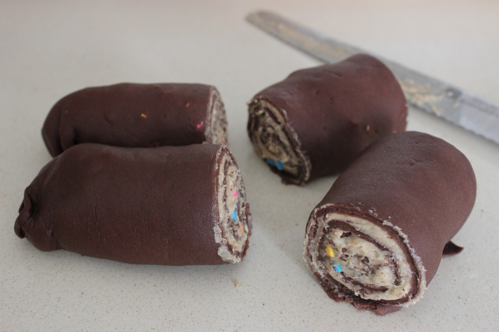 הכנתי בצק שמרים עם קקאו. מילאתי אותו בבצק עוגיות שוקולד צ’יפס. אפיתי. בצק השמרים תפח והשחים (כן, אני יודעת שהוא היה שחום מלכתחילה), בצק העוגיות נאפה חלקית – מספיק אפוי כדי לקבל את הטעם העוגייתי, מספיק לא אפוי כדי להישאר רך, “כמעט קרמי” לפי אסף (בחיי, הוא אכל שתי חתיכות לפני כמה דקות, והרגע שאלתי אותו לדעתו).