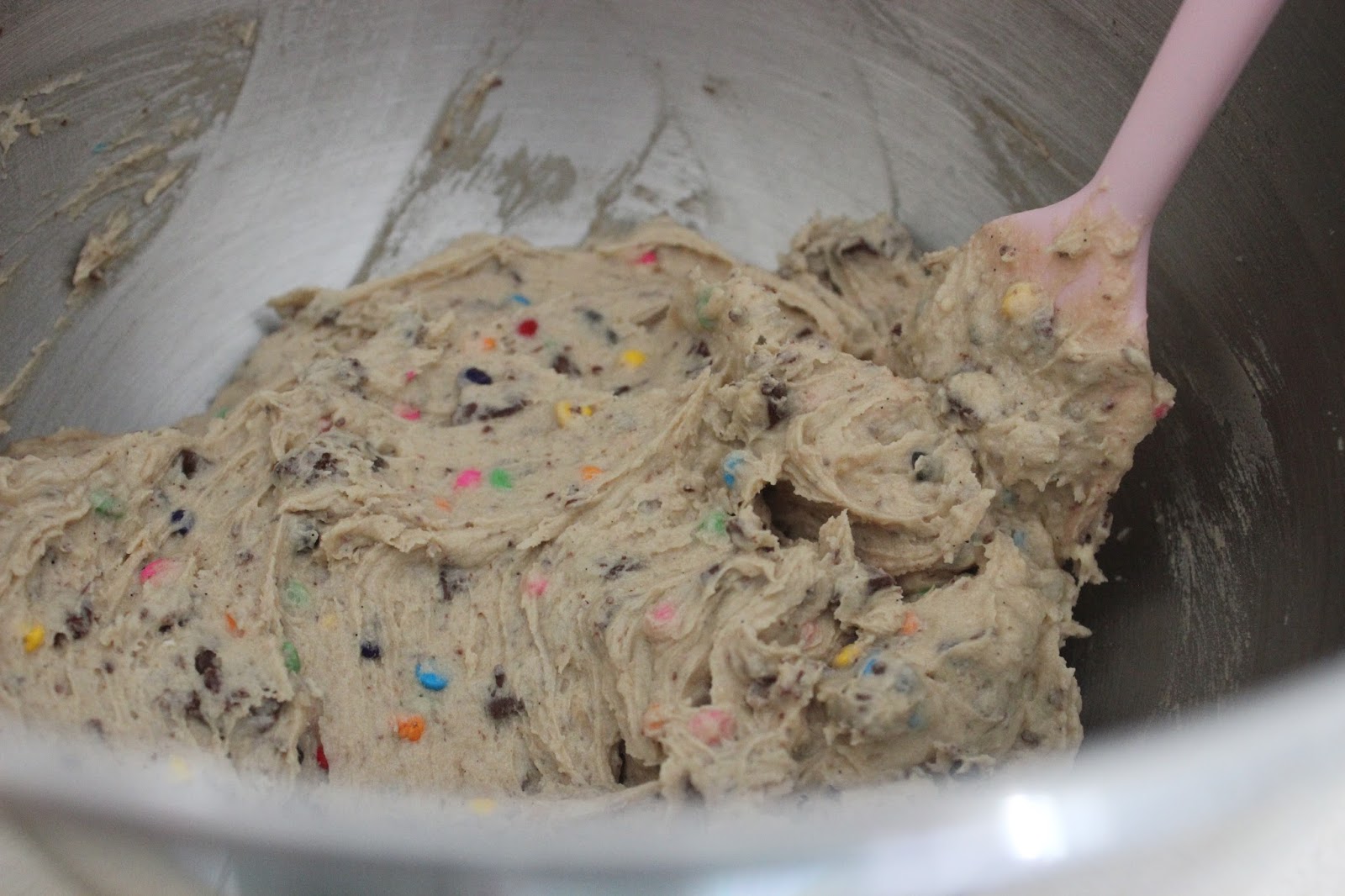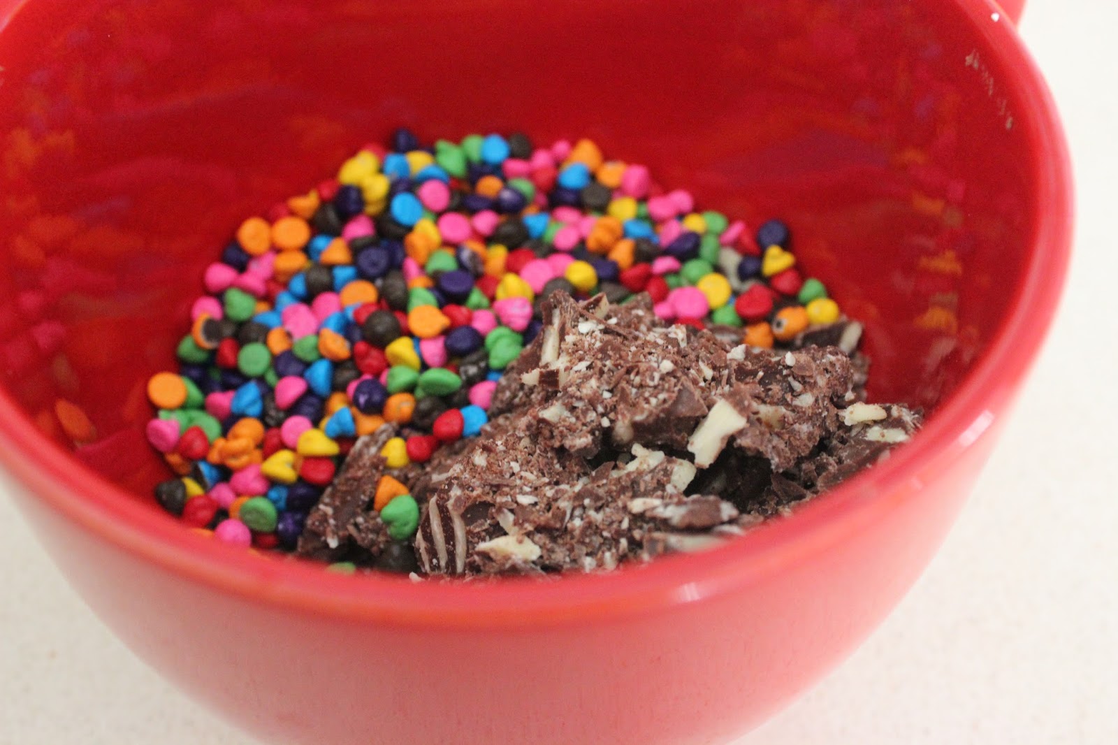 150 ג’ שוקולד צ’יפס צבעוניים (אני שילבתי בין שוקולד צ’יפס במילוי קוקוס – כן! – לבין מיני שוקולד צ’יפס צבעוניים)
